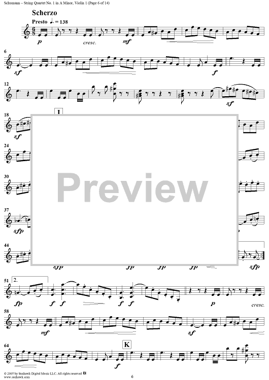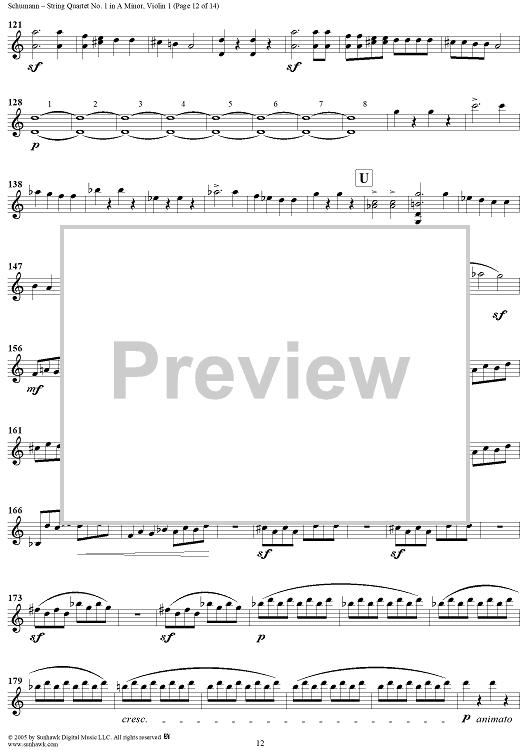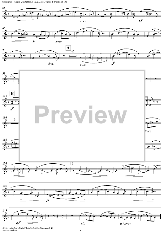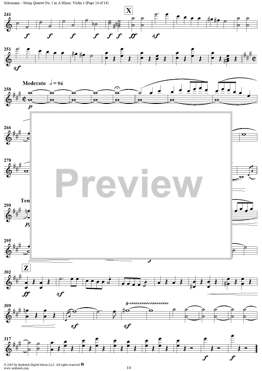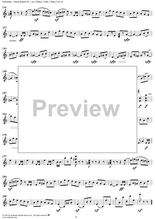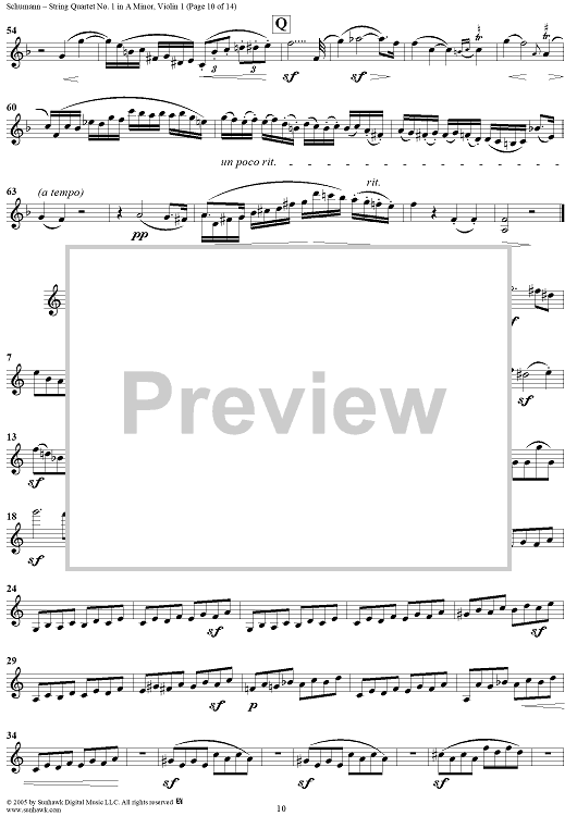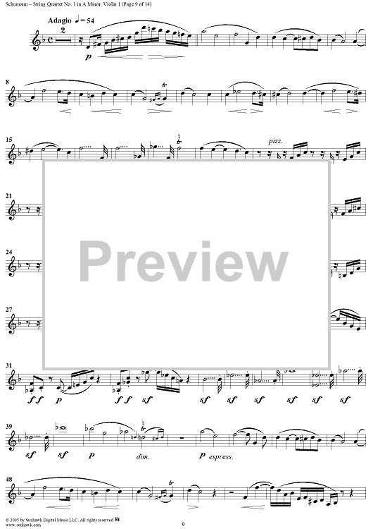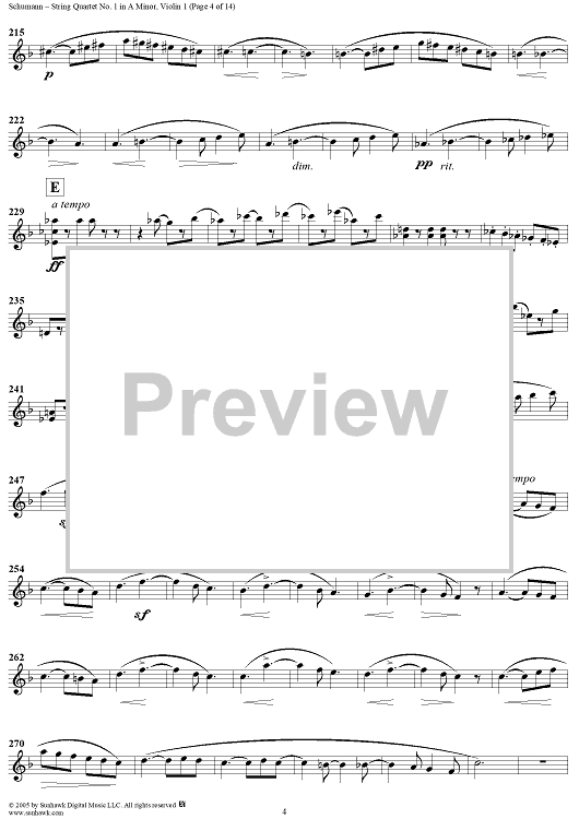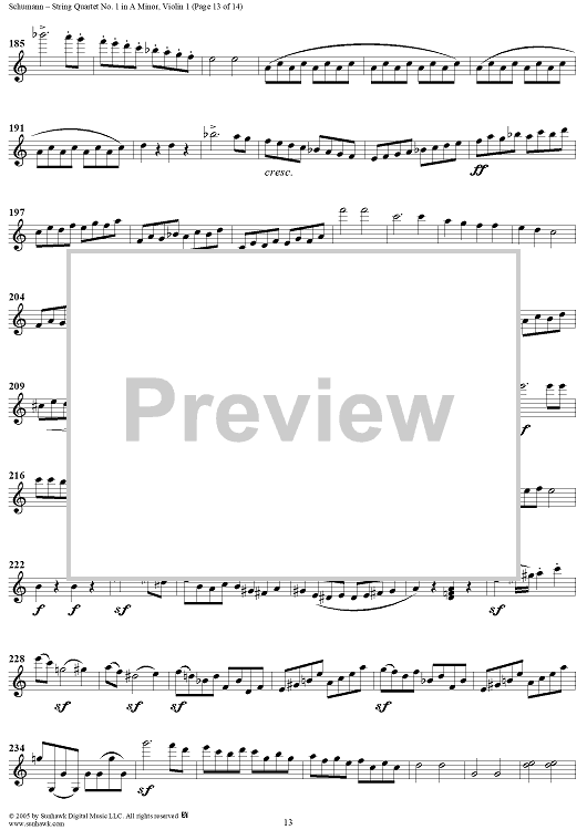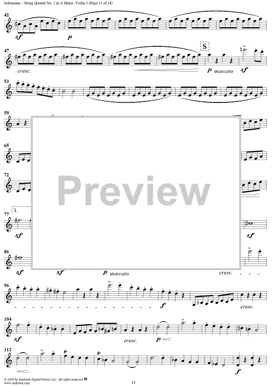 Digital Sheet Music for String Quartet No. 1 in A Minor, Op. 41, No. 1 - Violin 1 by Robert Schumann scored for String Quartet; id:309698