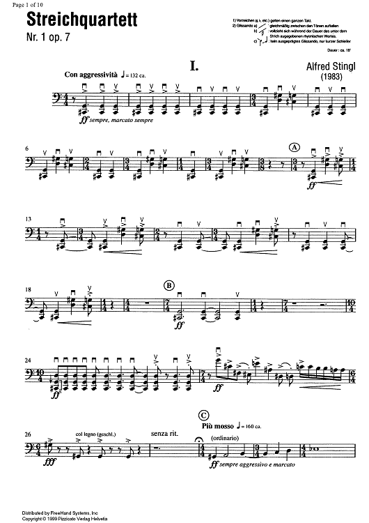 Digital Sheet Music for String Quartet No. 1 Op. 7 - Cello by Alfred Stingl scored for String Quartet; id:335123