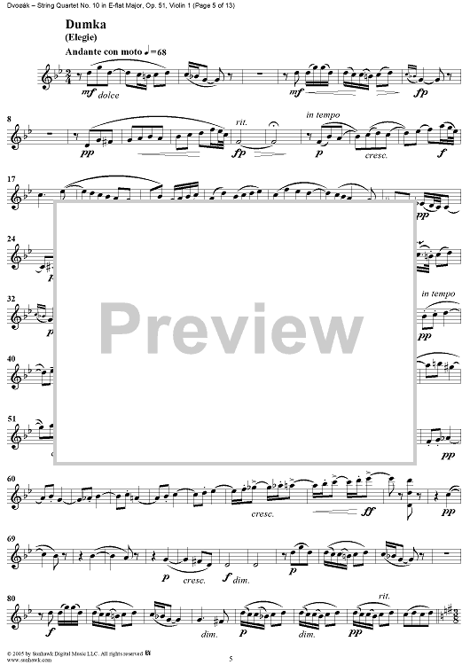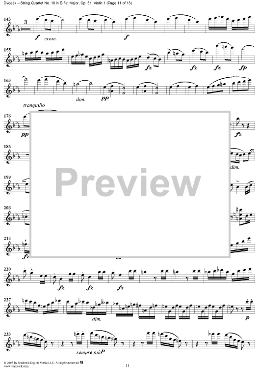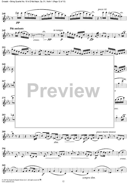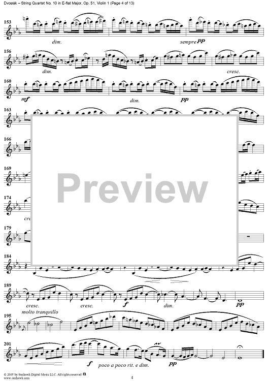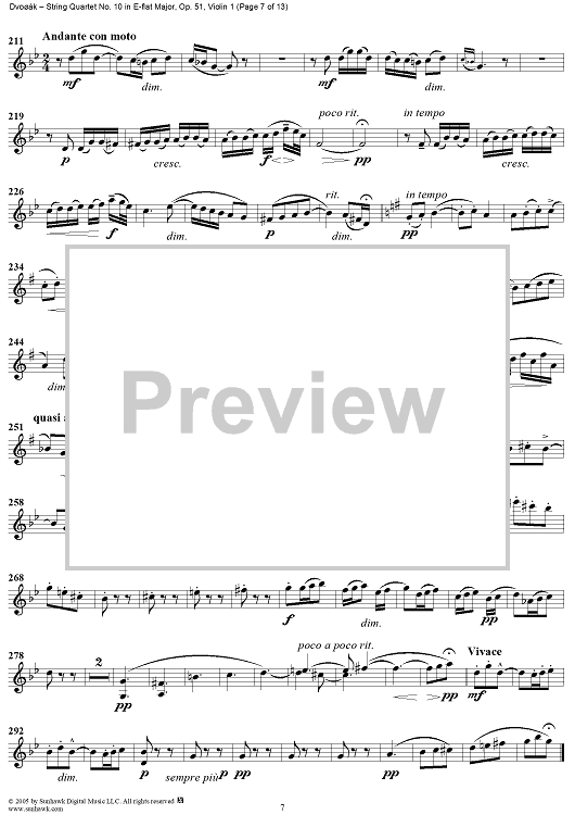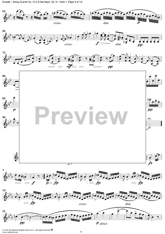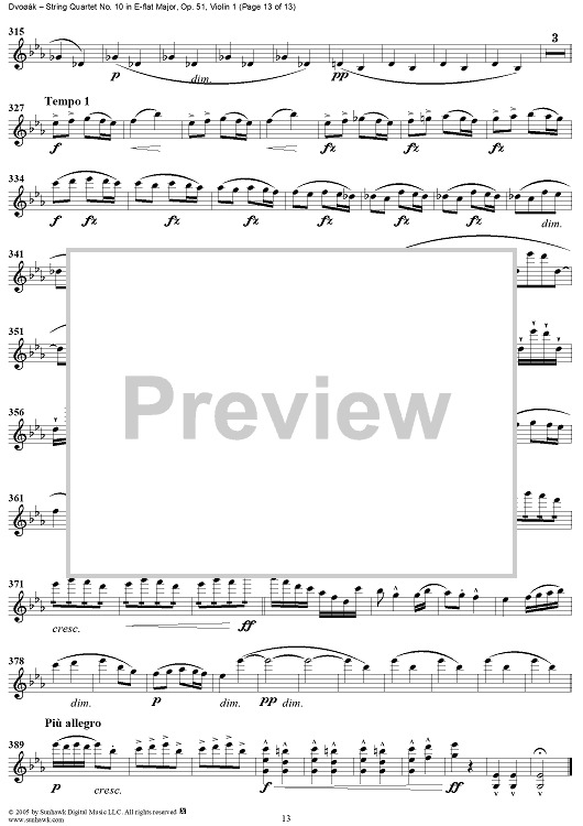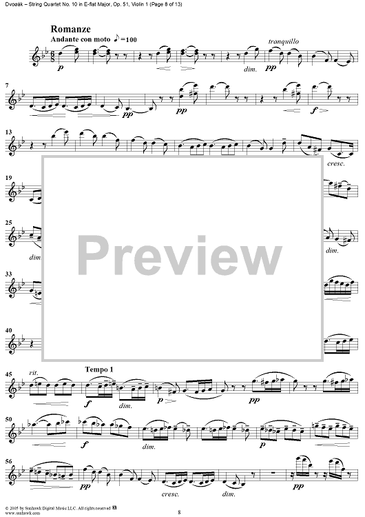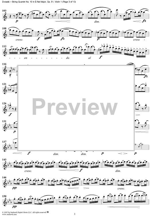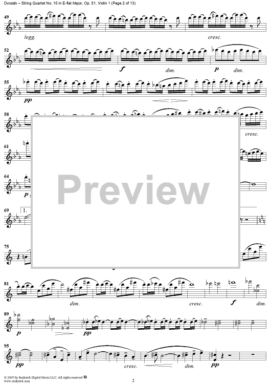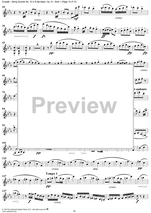 Digital Sheet Music for String Quartet No. 10 in E-flat Major, Op. 51 - Violin 1 by Antonín Dvorák scored for String Quartet; id:309693