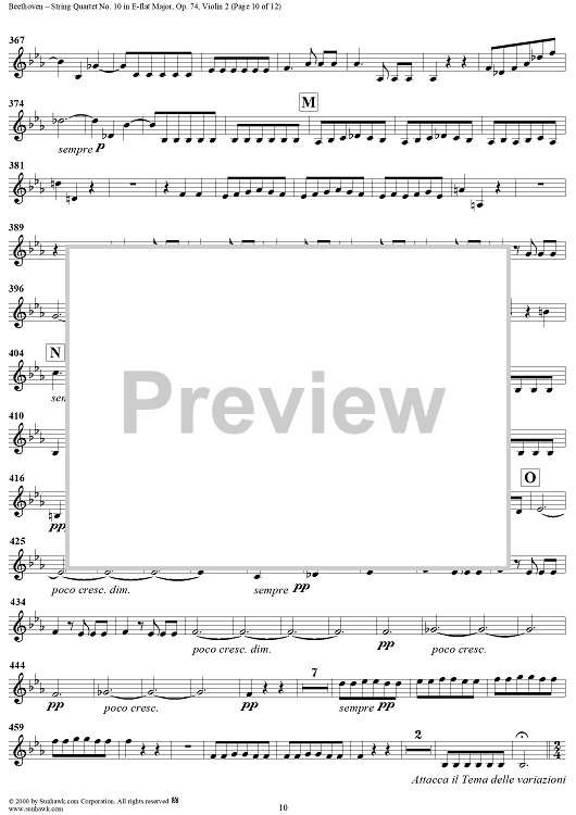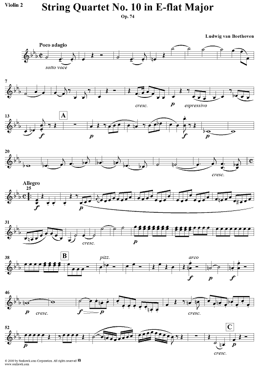 "String Quartet No. 10 in E-flat Major, Op. 74 - Violin 2" Sheet Music by Ludwig van Beethoven