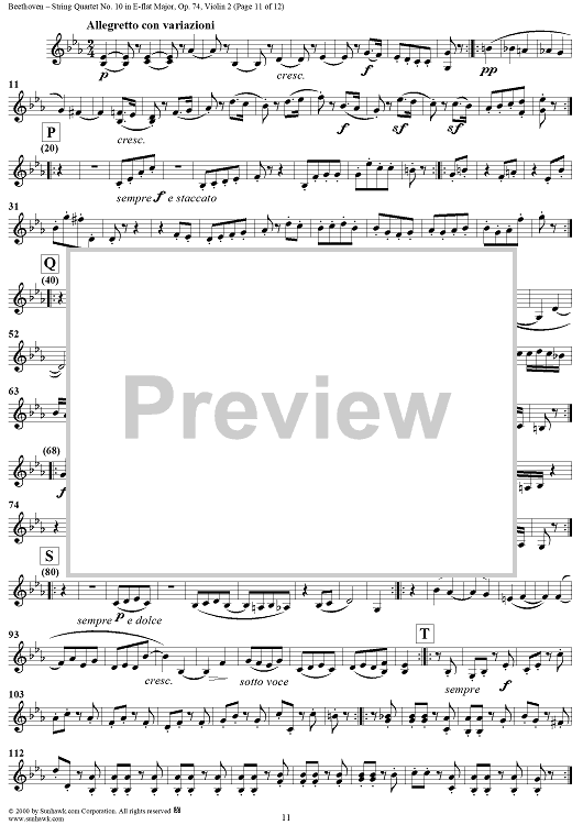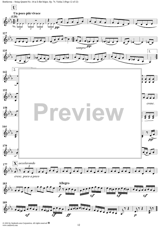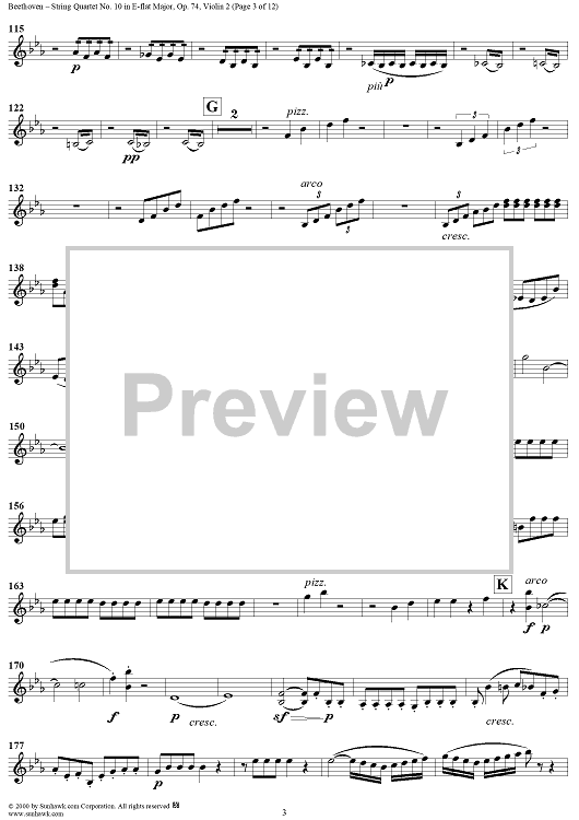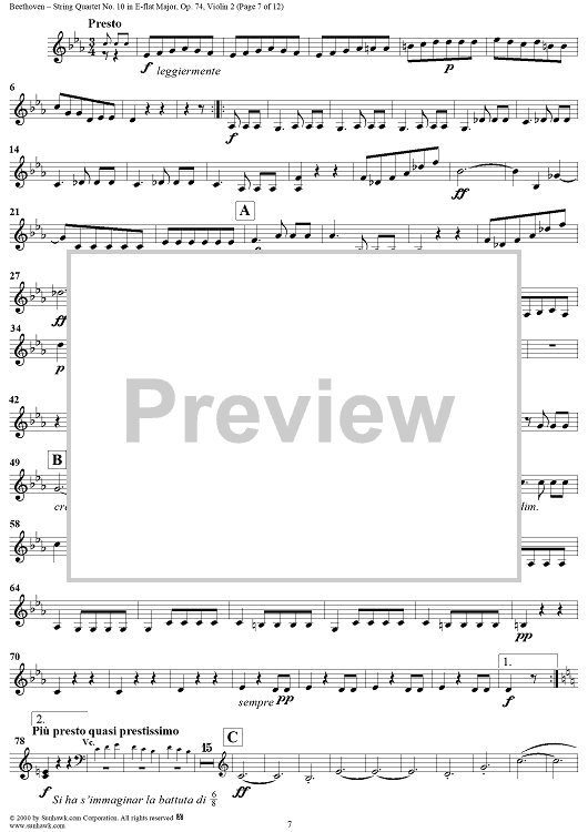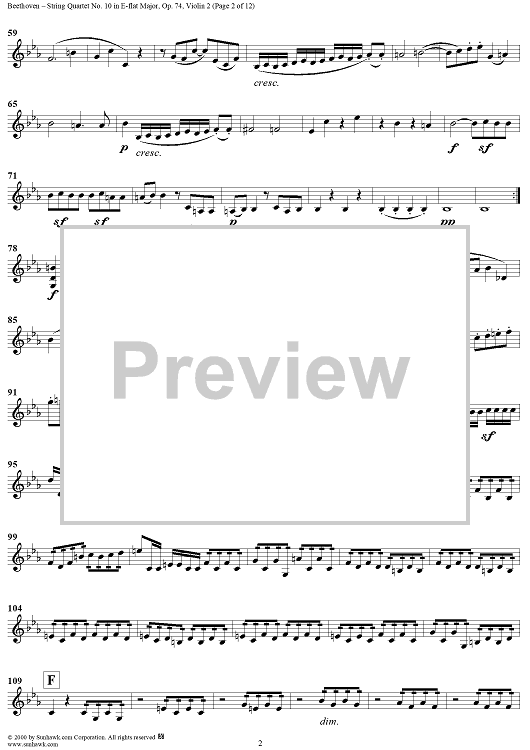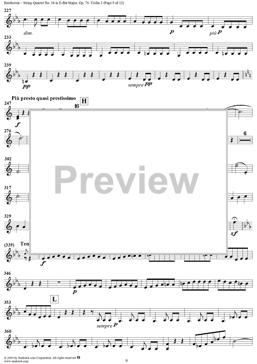 Digital Sheet Music for String Quartet No. 10 in E-flat Major, Op. 74 - Violin 2 by Ludwig van Beethoven scored for String Quartet; id:275512