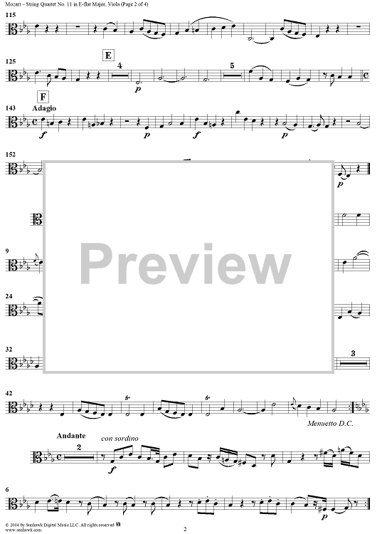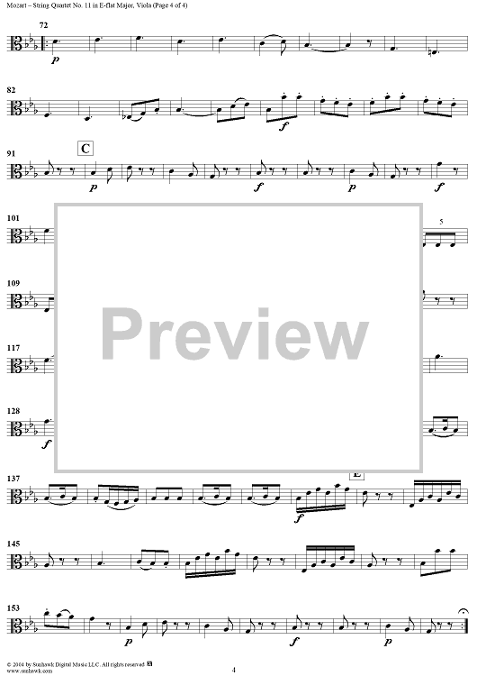 Digital Sheet Music for String Quartet No. 11 in E-flat Major, K171 - Viola by Wolfgang Amadeus Mozart scored for String Quartet; id:304132
