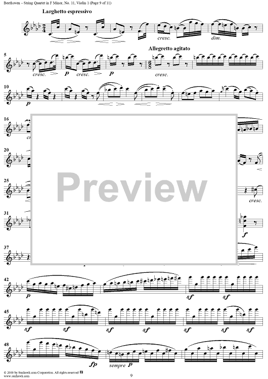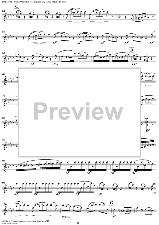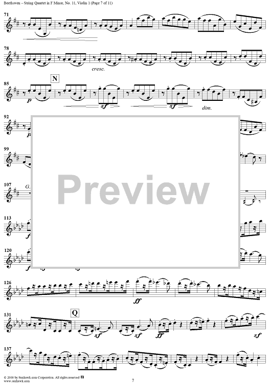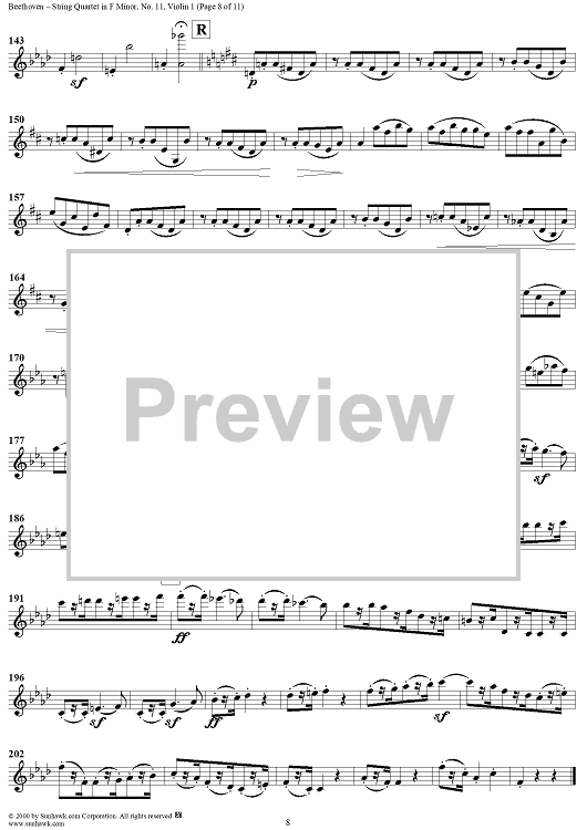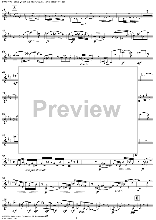 Digital Sheet Music for String Quartet No. 11 in F Minor, Op. 95 - Violin 1 by Ludwig van Beethoven scored for String Quartet; id:275505