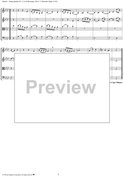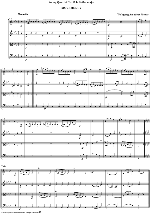 Digital Sheet Music for String Quartet No. 11, Movement 2 - Score by Wolfgang Amadeus Mozart scored for String Quartet; id:96016