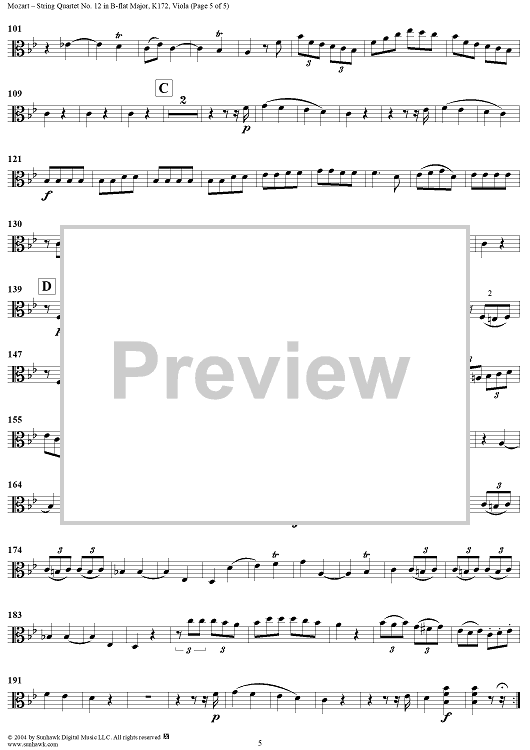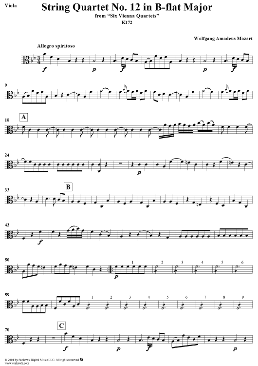"String Quartet No. 12 in B-flat Major, K172 - Viola" Sheet Music by Wolfgang Amadeus Mozart
