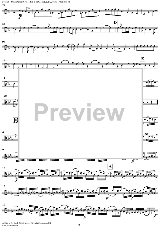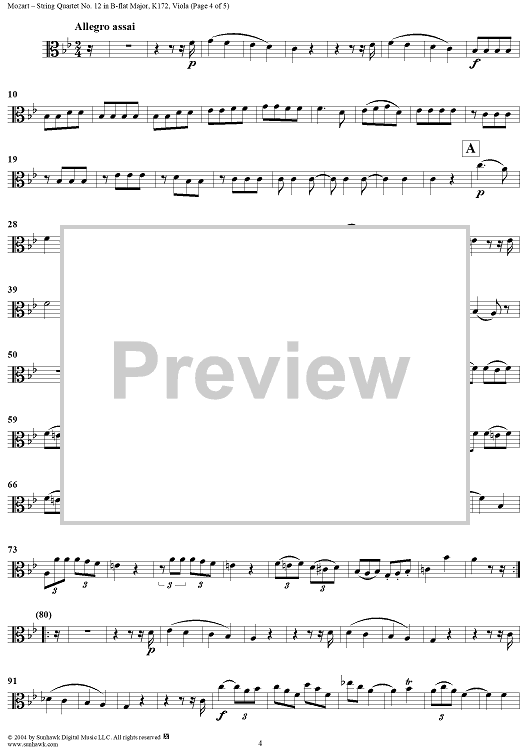 Digital Sheet Music for String Quartet No. 12 in B-flat Major, K172 - Viola by Wolfgang Amadeus Mozart scored for String Quartet; id:304137