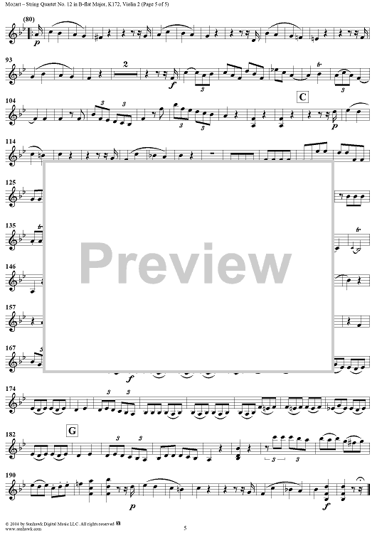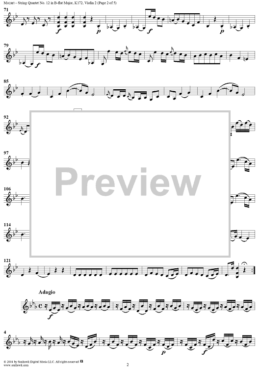 Digital Sheet Music for String Quartet No. 12 in B-flat Major, K172 - Violin 2 by Wolfgang Amadeus Mozart scored for String Quartet; id:304136