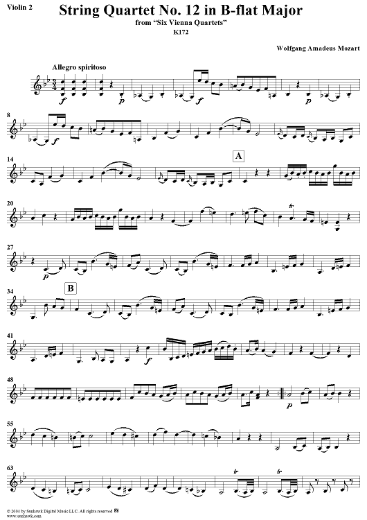"String Quartet No. 12 in B-flat Major, K172 - Violin 2" Sheet Music by Wolfgang Amadeus Mozart