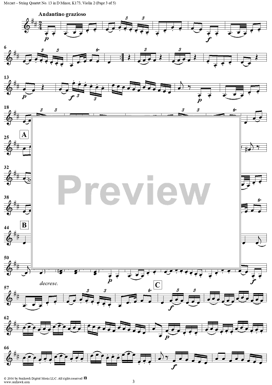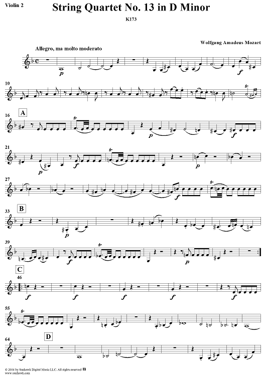 Digital Sheet Music for String Quartet No. 13 in D Minor, K173 - Violin 2 by Wolfgang Amadeus Mozart scored for String Quartet; id:304141