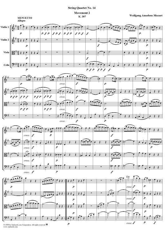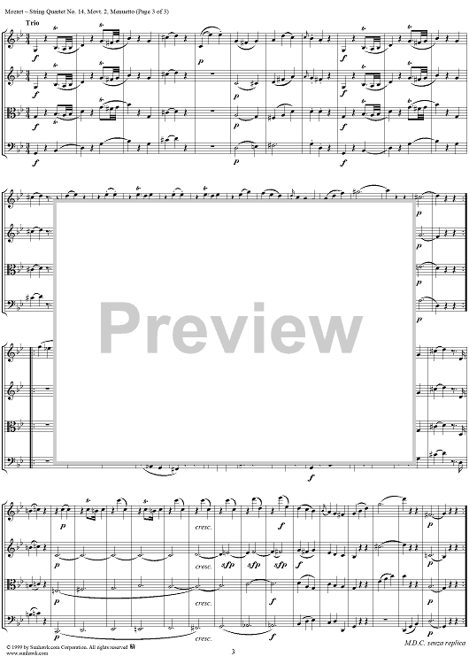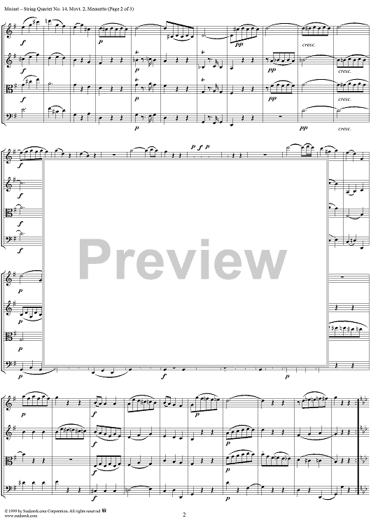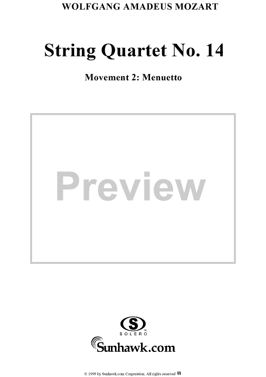 Digital Sheet Music for String Quartet No. 14, Movement 2 - Score by Wolfgang Amadeus Mozart scored for String Quartet; id:252613
