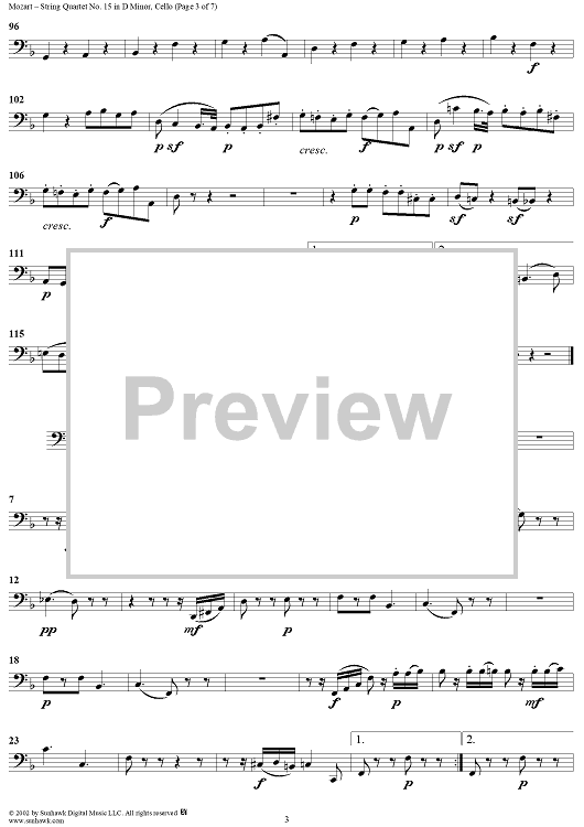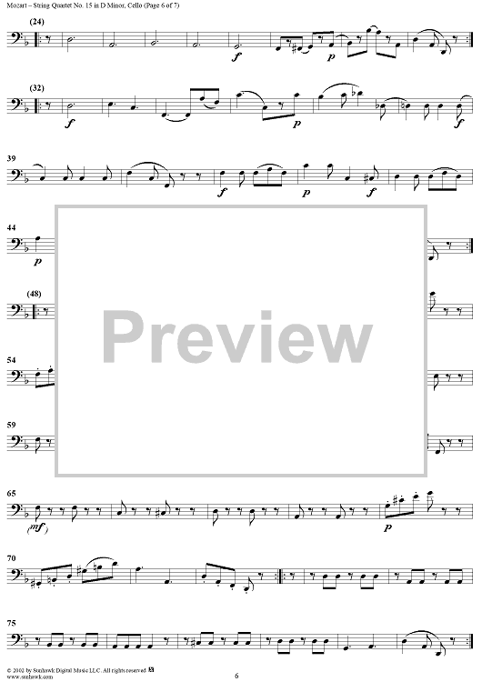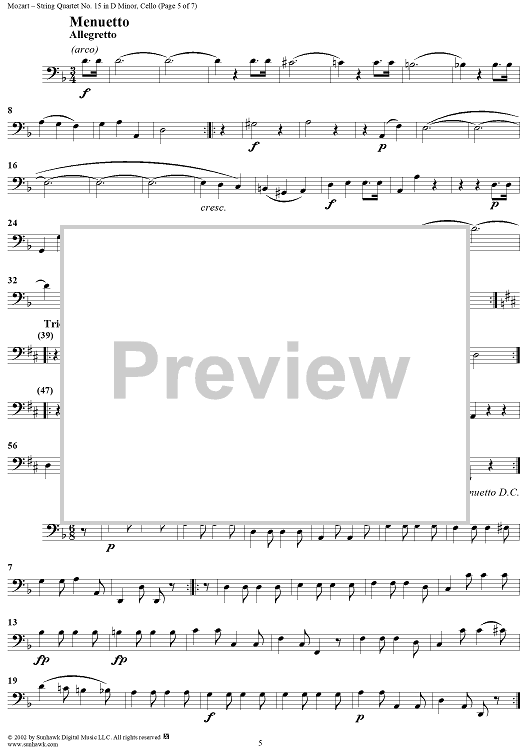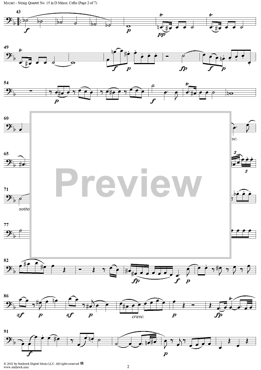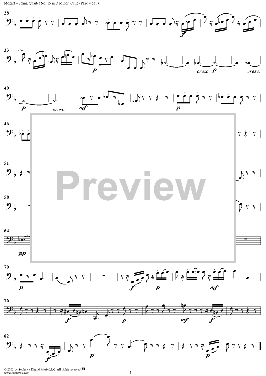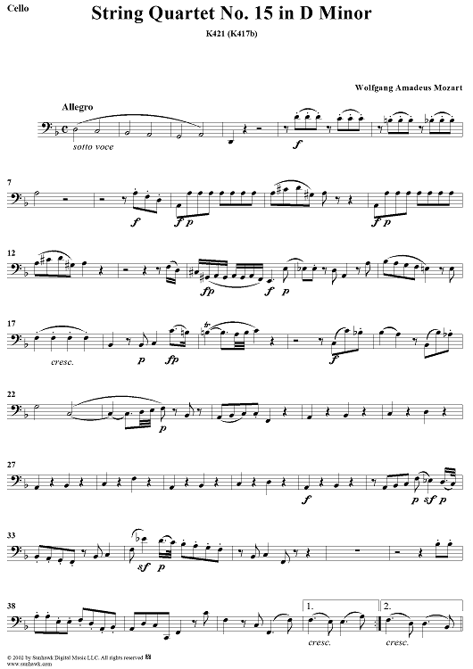 Digital Sheet Music for String Quartet No. 15 in D Minor, K421 - Cello by Wolfgang Amadeus Mozart scored for String Quartet; id:253297