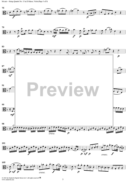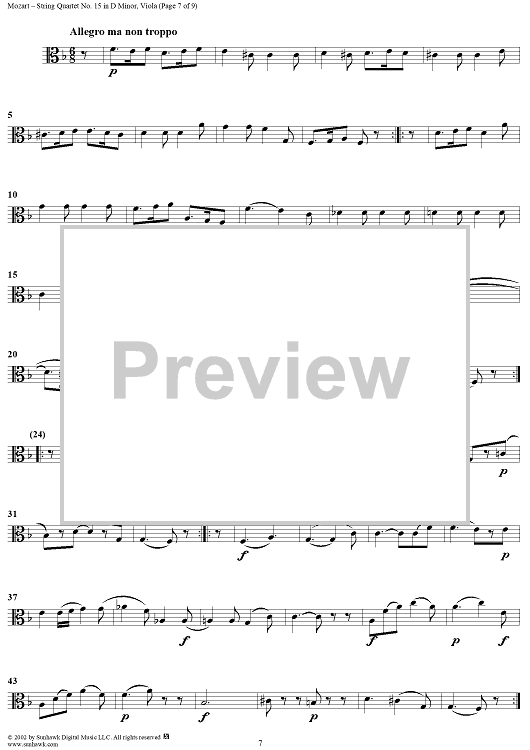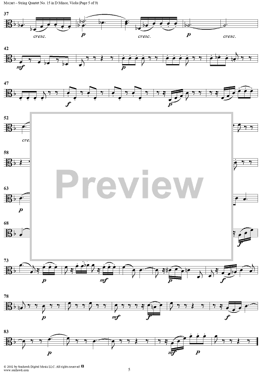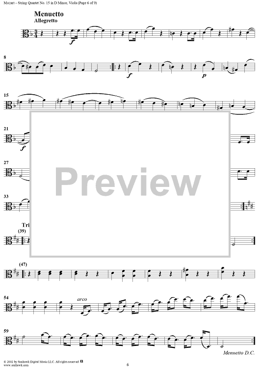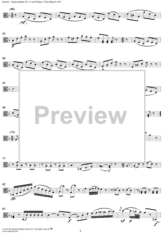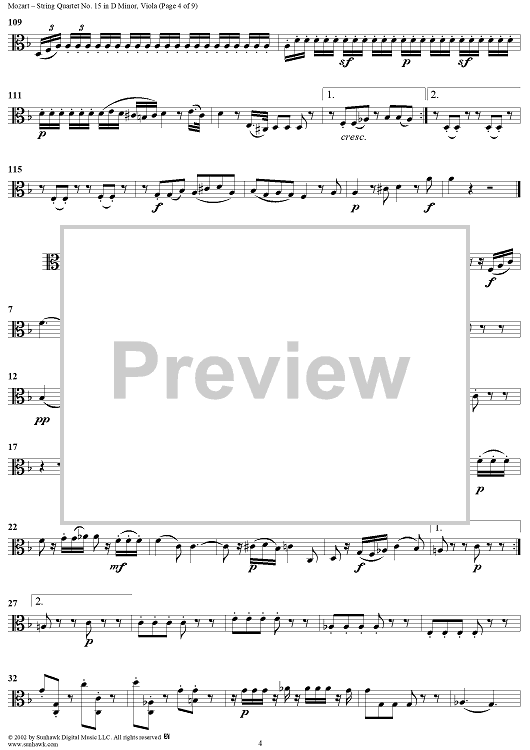 Digital Sheet Music for String Quartet No. 15 in D Minor, K421 - Viola by Wolfgang Amadeus Mozart scored for String Quartet; id:252615