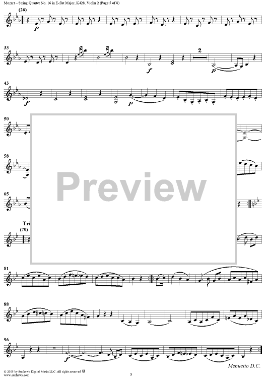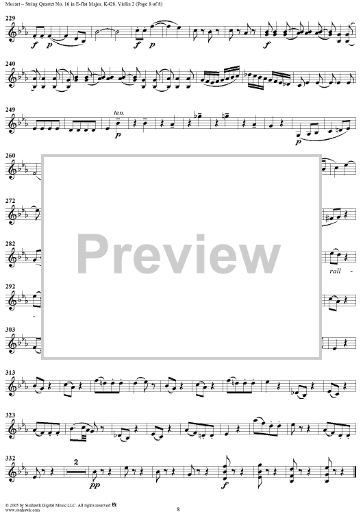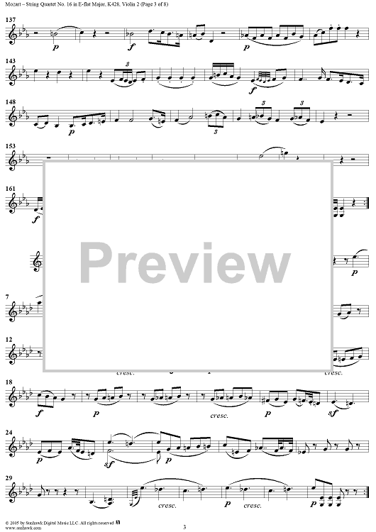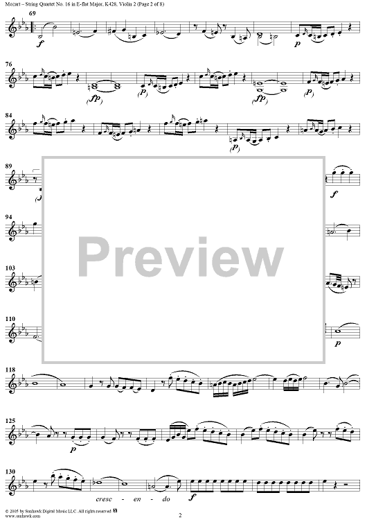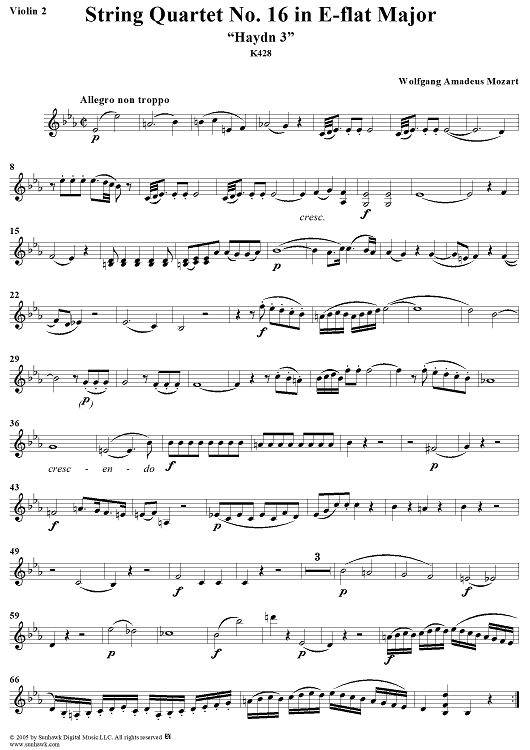 Digital Sheet Music for String Quartet No. 16 in E-flat Major, K428 - Violin 2 by Wolfgang Amadeus Mozart scored for String Quartet; id:309243