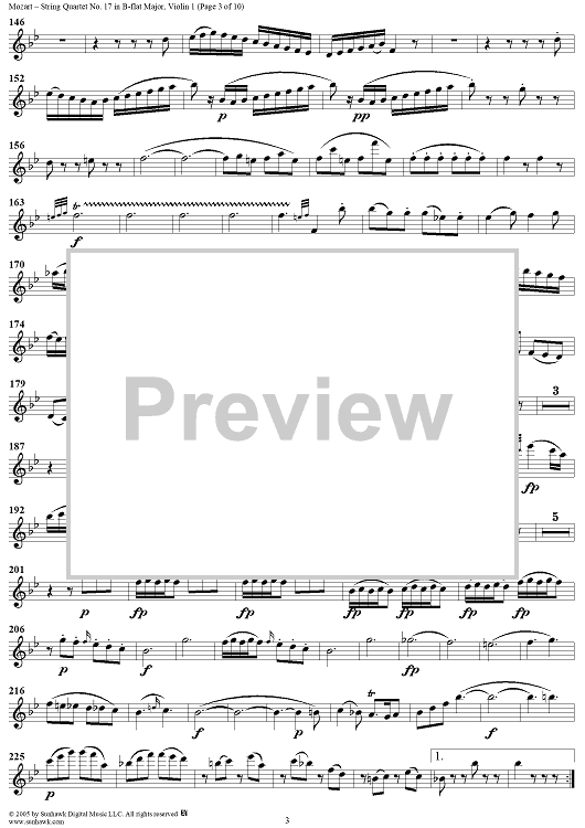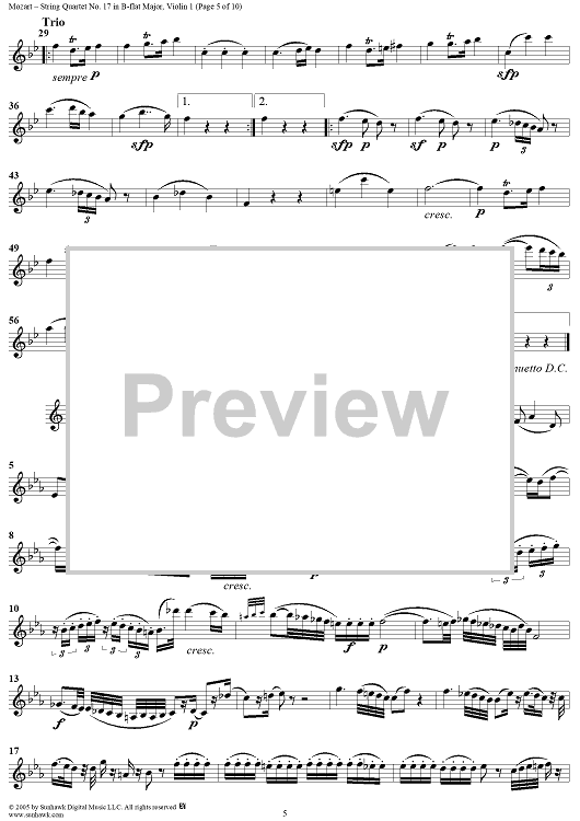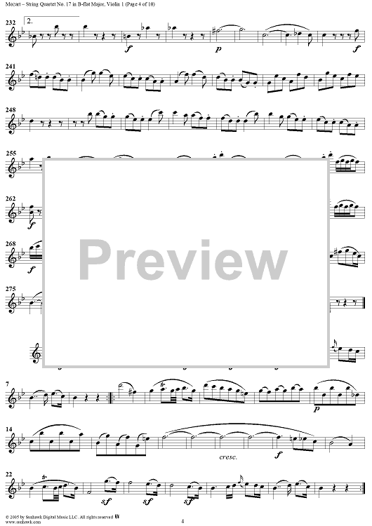 Digital Sheet Music for String Quartet No. 17 in B-flat Major, K458 - Violin 1 by Wolfgang Amadeus Mozart scored for String Quartet; id:309257