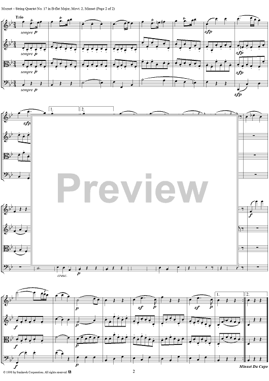 Digital Sheet Music for String Quartet No. 17, Movement 2 - Score by Wolfgang Amadeus Mozart scored for String Quartet; id:96041