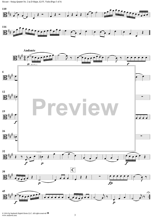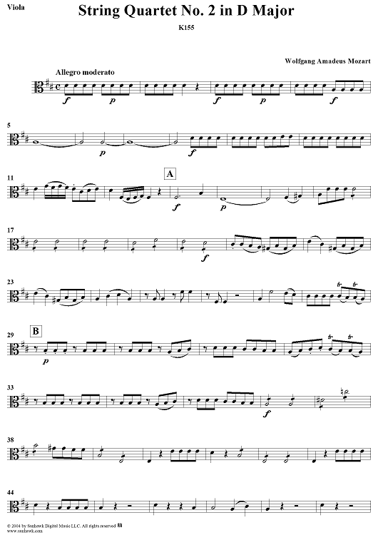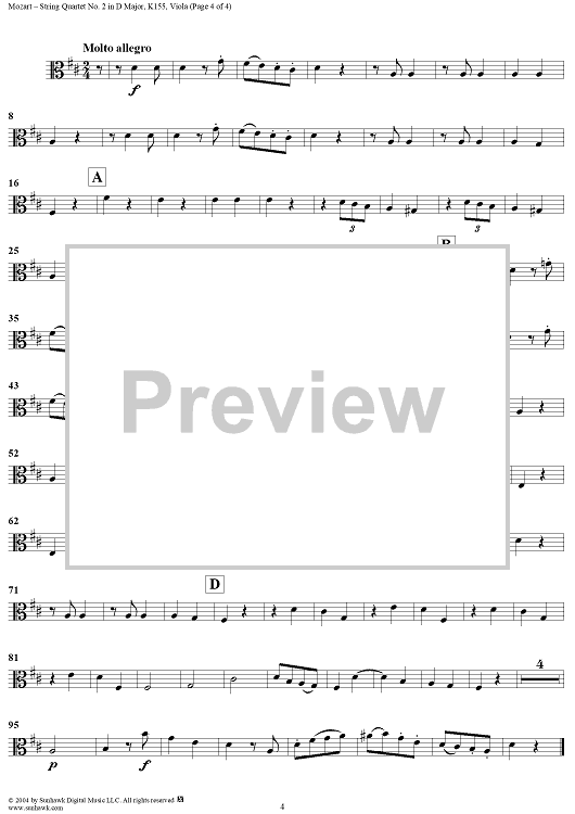 Digital Sheet Music for String Quartet No. 2 in D Major, K155 - Viola by Wolfgang Amadeus Mozart scored for String Quartet; id:304080