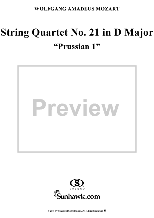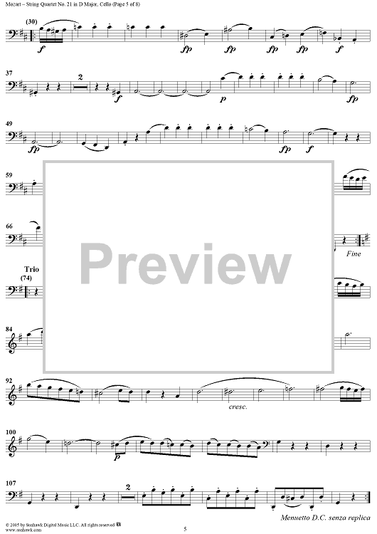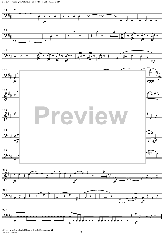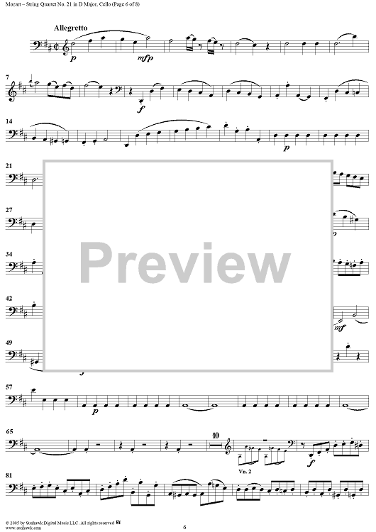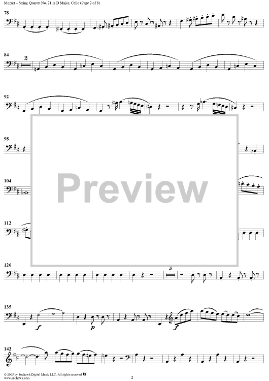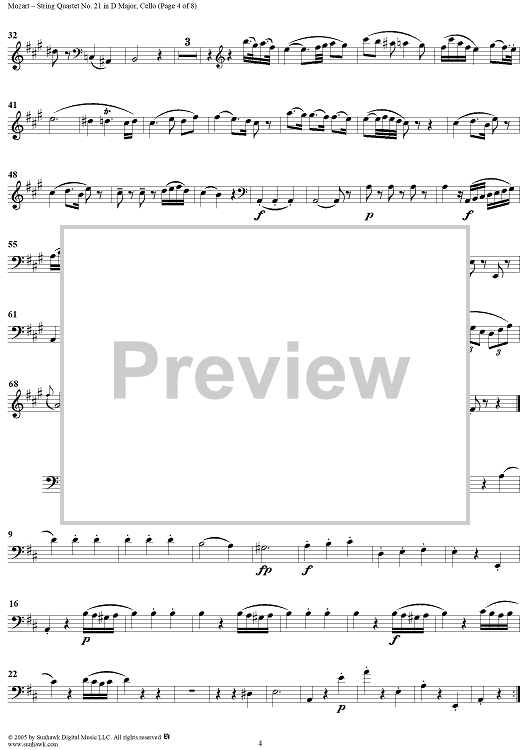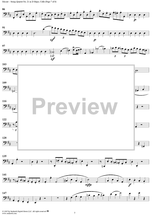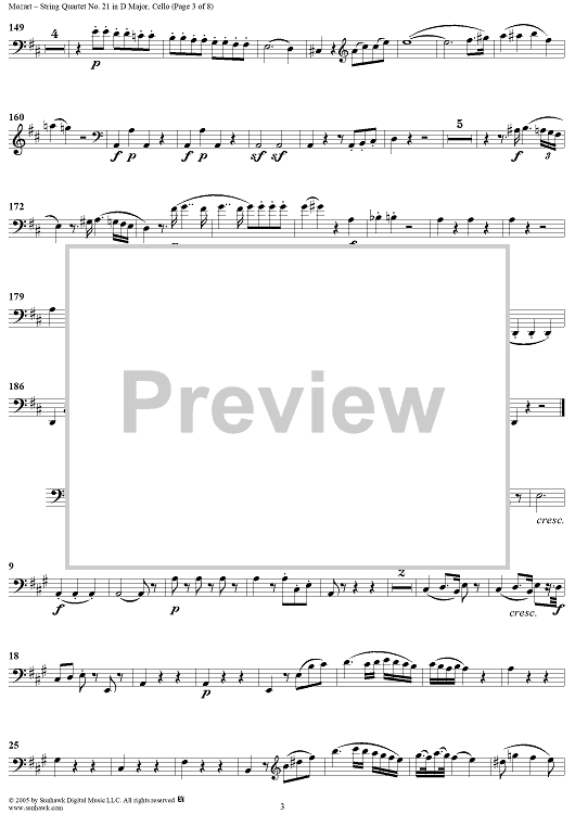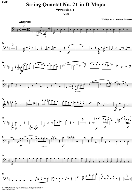 Digital Sheet Music for String Quartet No. 21 in D Major, K575 - Cello by Wolfgang Amadeus Mozart scored for String Quartet; id:309272