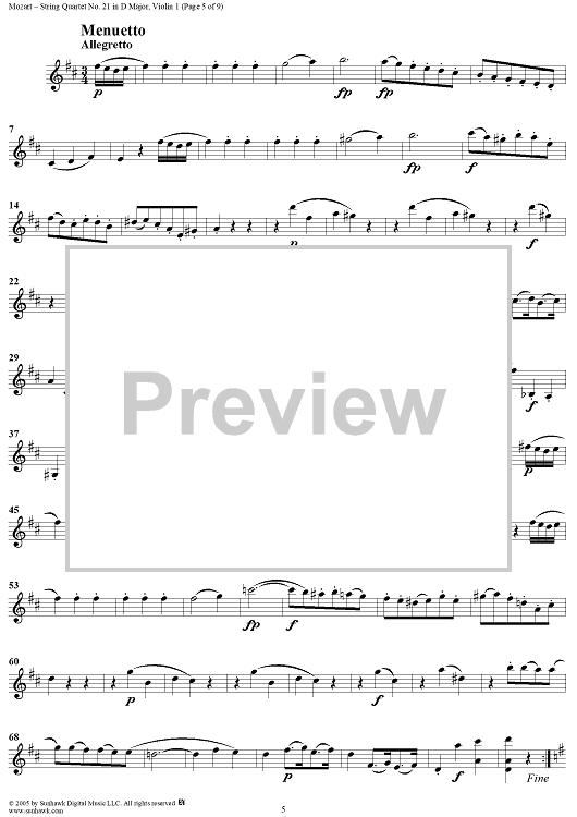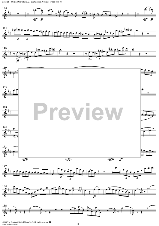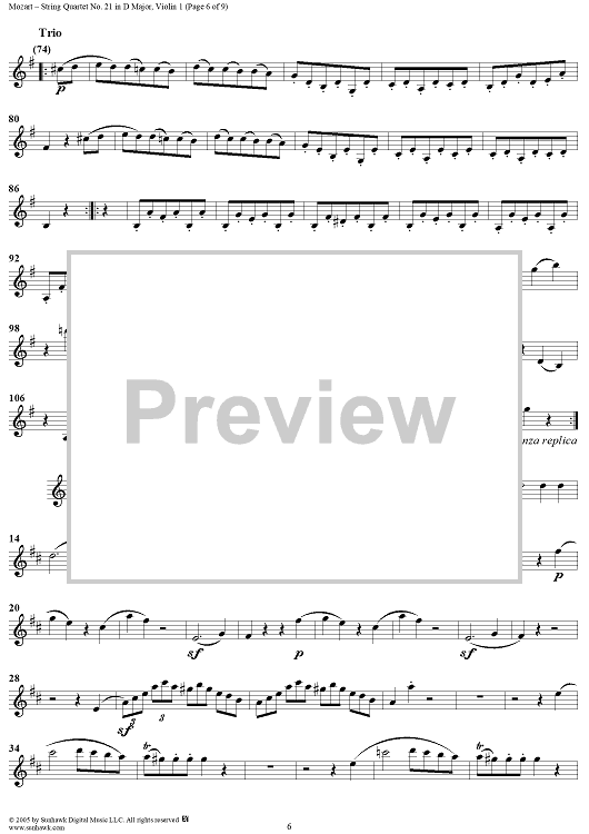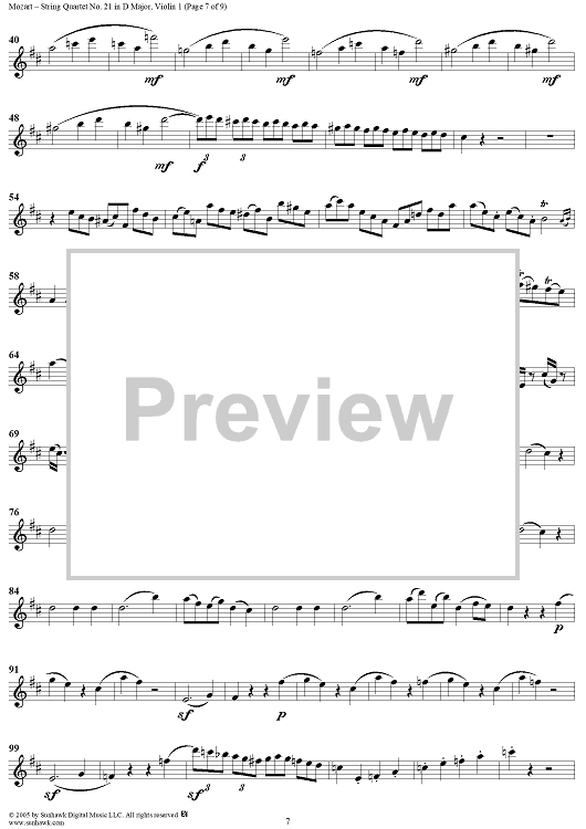 Digital Sheet Music for String Quartet No. 21 in D Major, K575 - Violin 1 by Wolfgang Amadeus Mozart scored for String Quartet; id:309269