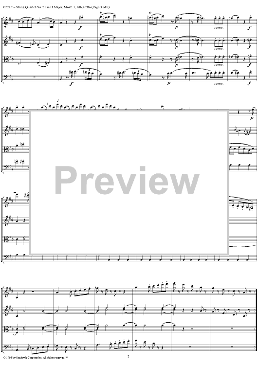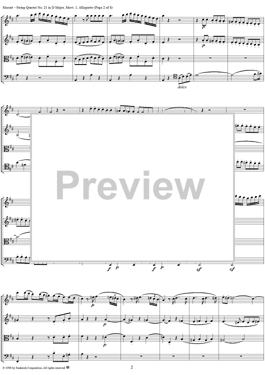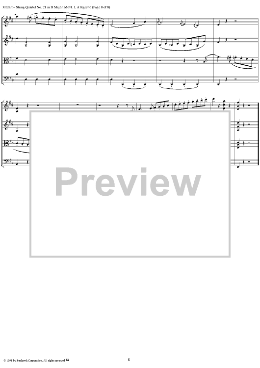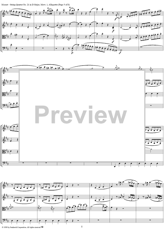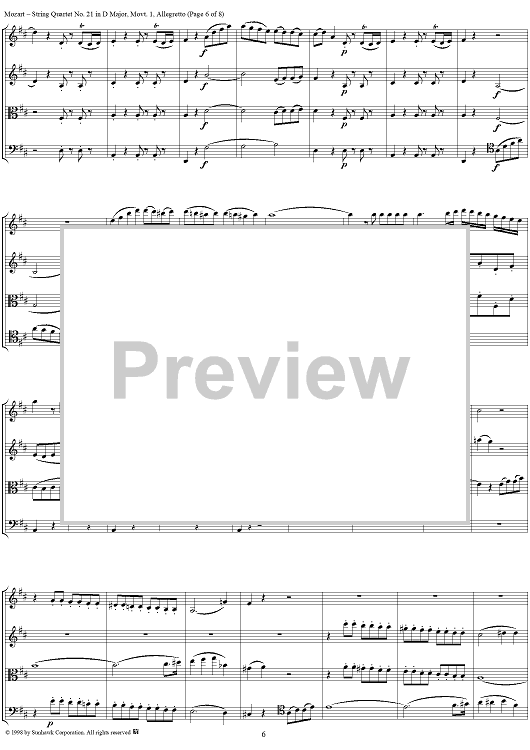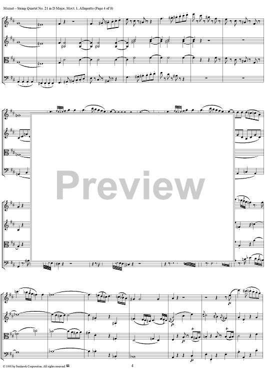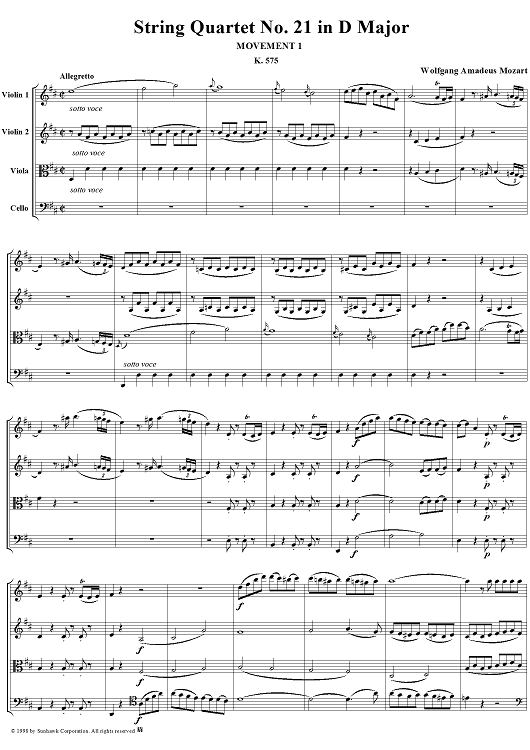 Digital Sheet Music for String Quartet No. 21, Movement 1 - Score by Wolfgang Amadeus Mozart scored for String Quartet; id:108876