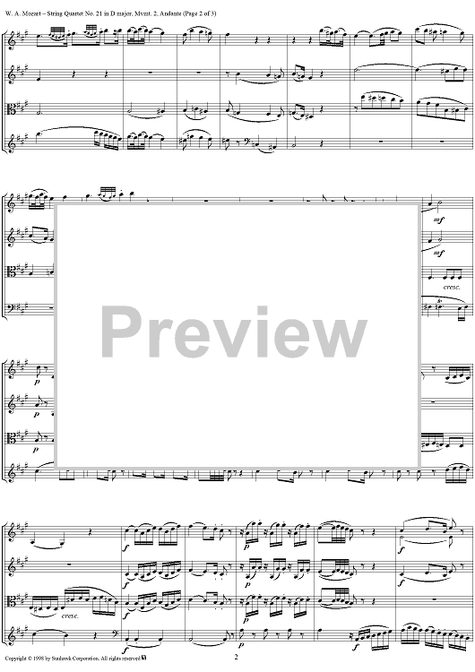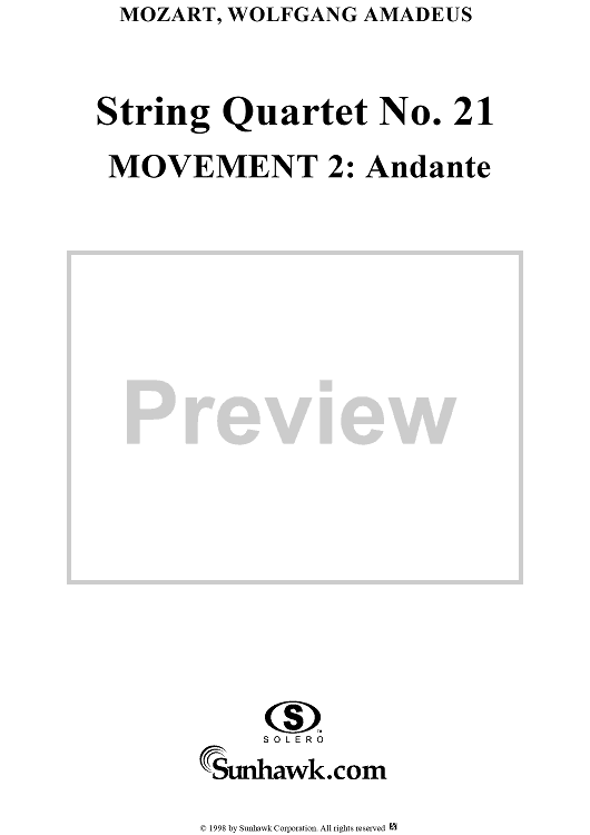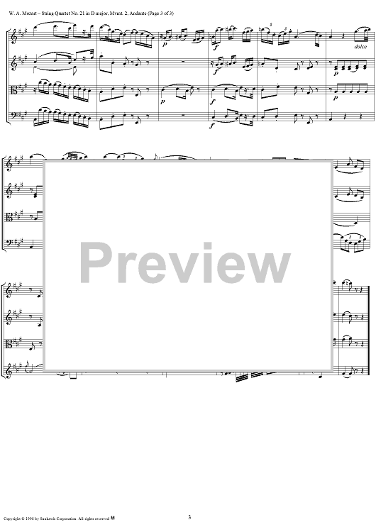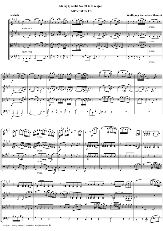 Digital Sheet Music for String Quartet No. 21, Movement 2 - Score by Wolfgang Amadeus Mozart scored for String Quartet; id:252628