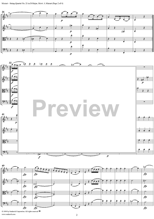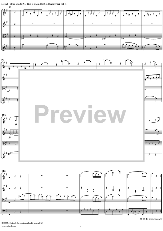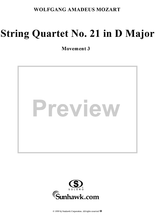 Digital Sheet Music for String Quartet No. 21, Movement 3 - Score by Wolfgang Amadeus Mozart scored for String Quartet; id:118569