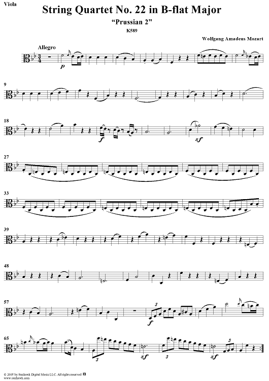 "String Quartet No. 22 in B-flat Major, K589 - Viola" Sheet Music by Wolfgang Amadeus Mozart