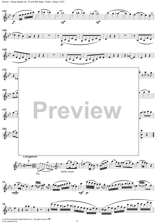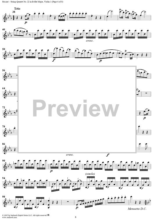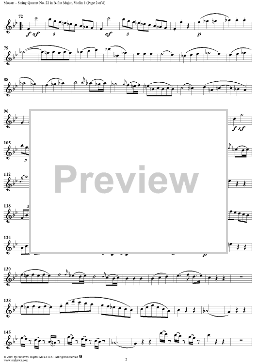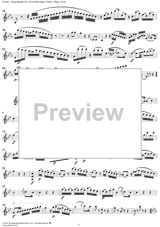 Digital Sheet Music for String Quartet No. 22 in B-flat Major, K589 - Violin 1 by Wolfgang Amadeus Mozart scored for String Quartet; id:309273