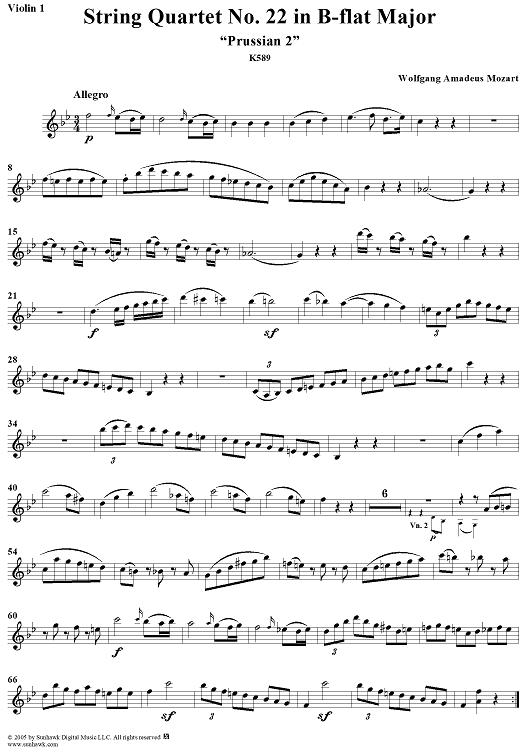 "String Quartet No. 22 in B-flat Major, K589 - Violin 1" Sheet Music by Wolfgang Amadeus Mozart