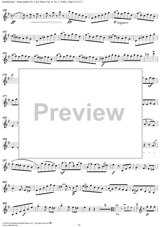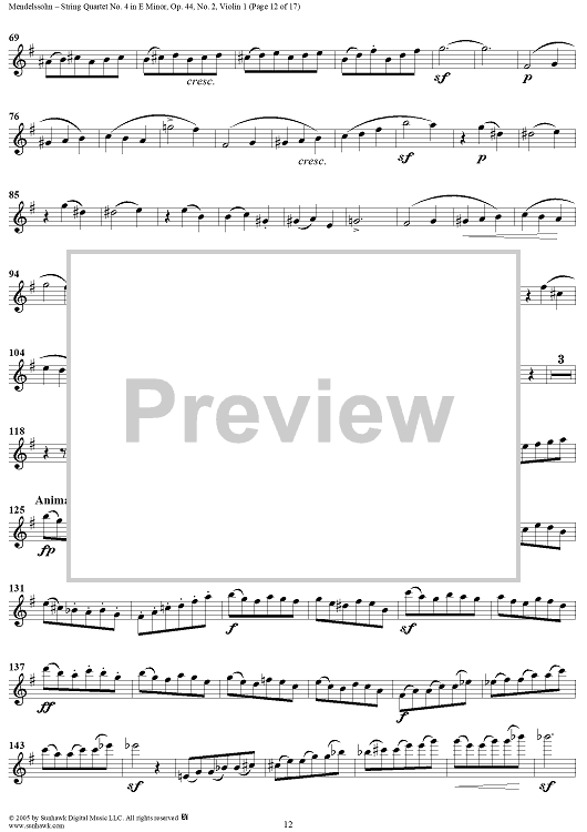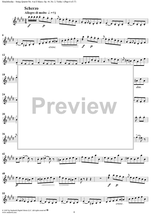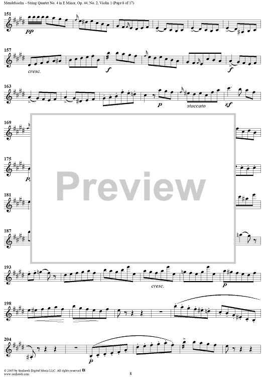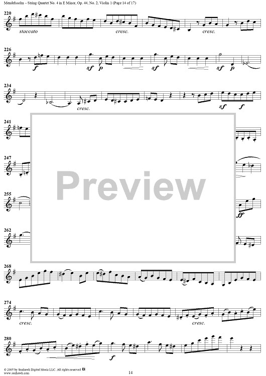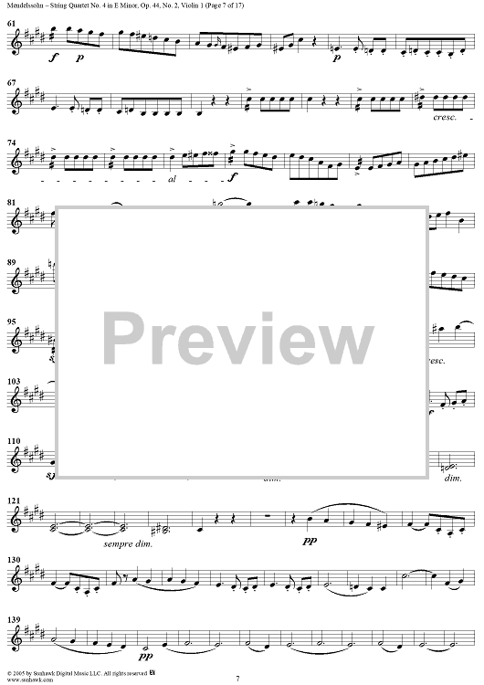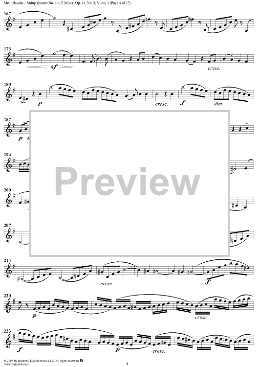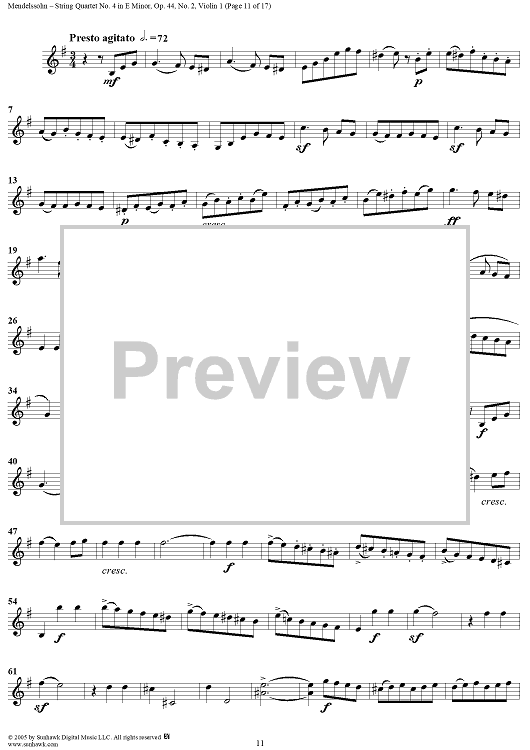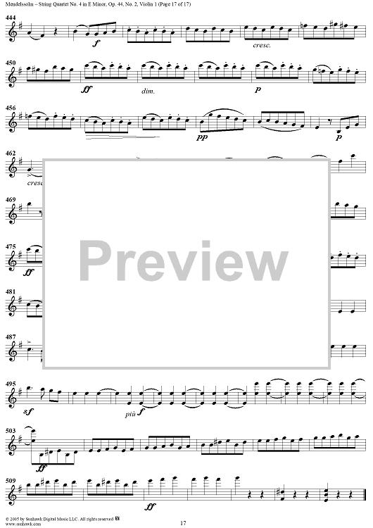 Digital Sheet Music for String Quartet No. 4 in E Minor, Op. 44, No. 2 - Violin 1 by Felix Mendelssohn scored for String Quartet; id:309530