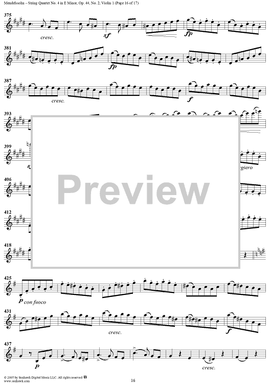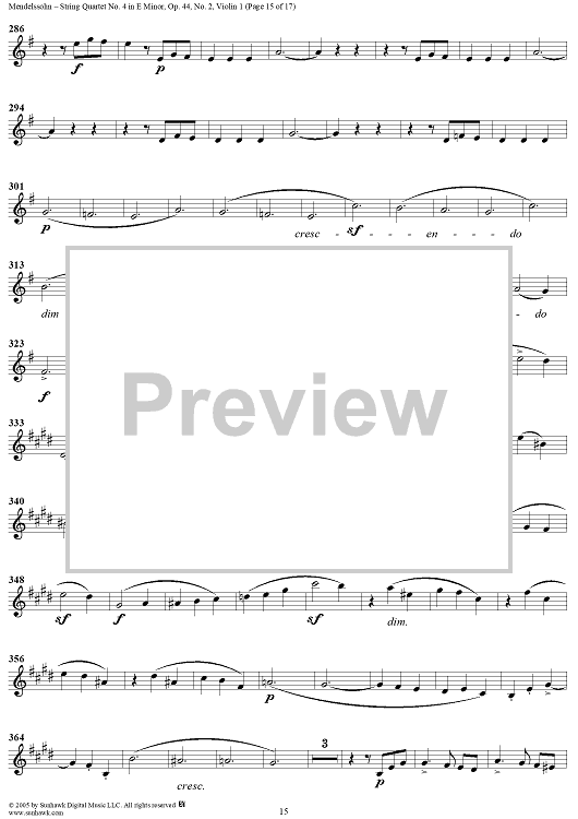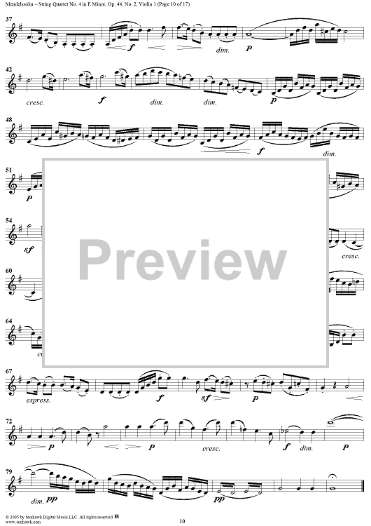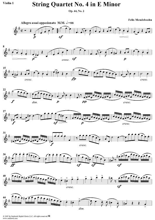 "String Quartet No. 4 in E Minor, Op. 44, No. 2 - Violin 1" Sheet Music by Felix Mendelssohn