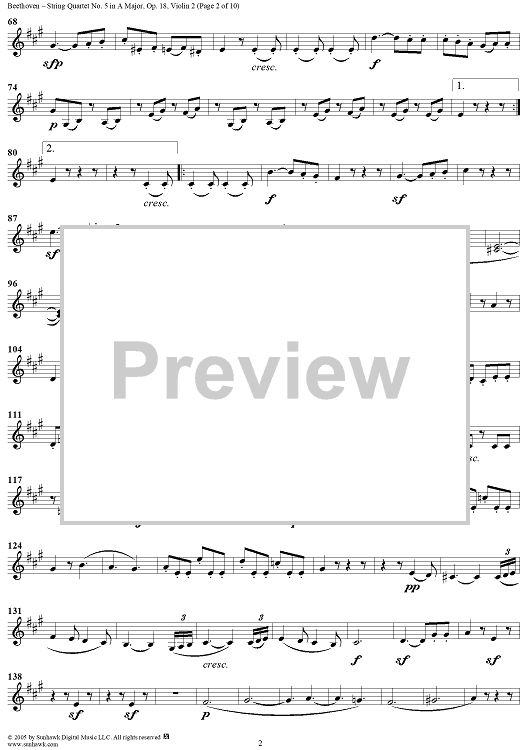 "String Quartet No. 5 in A Major, Op. 18, No. 5 - Violin 2" Sheet Music by Ludwig van Beethoven
