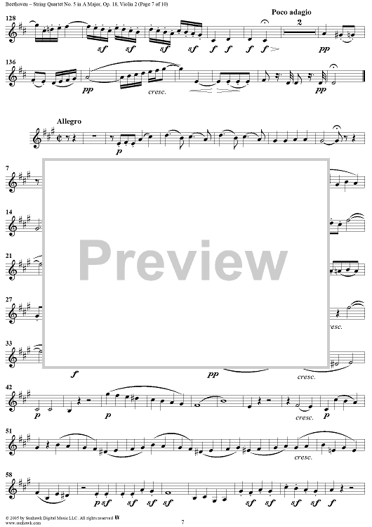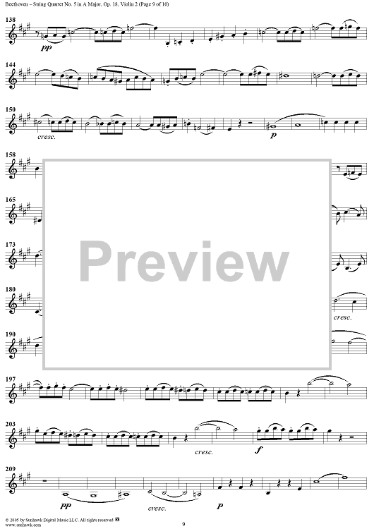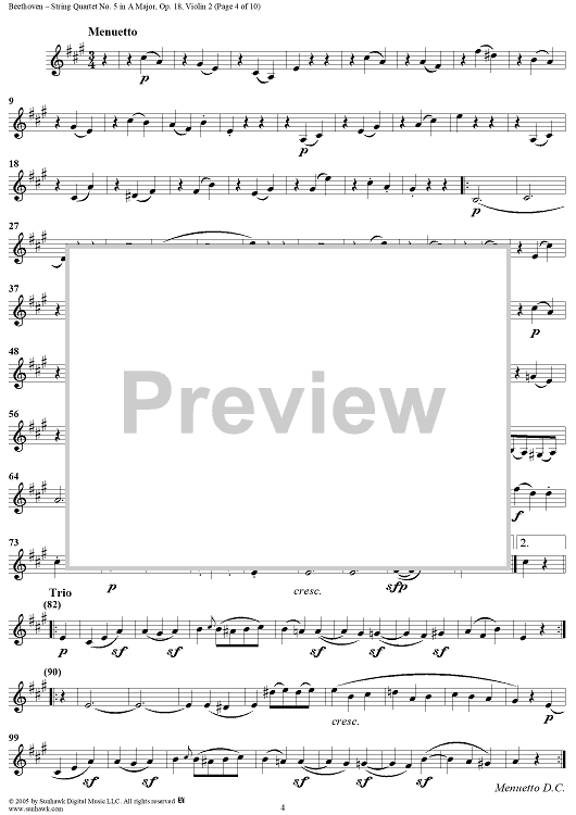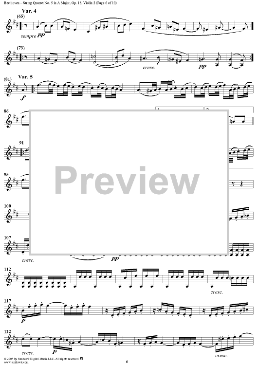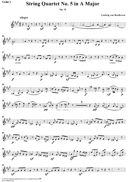 Digital Sheet Music for String Quartet No. 5 in A Major, Op. 18, No. 5 - Violin 2 by Ludwig van Beethoven scored for String Quartet; id:308519