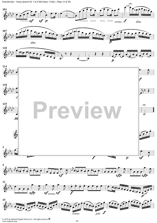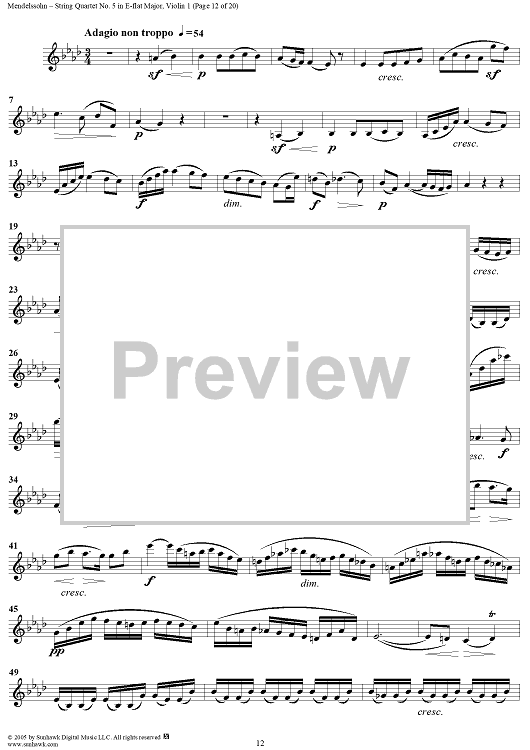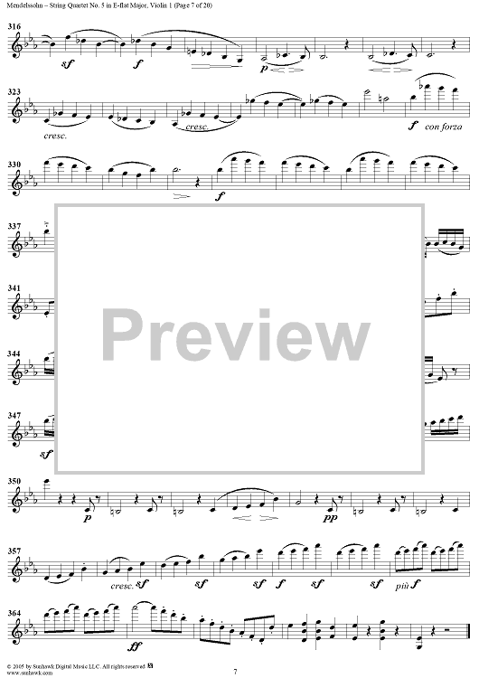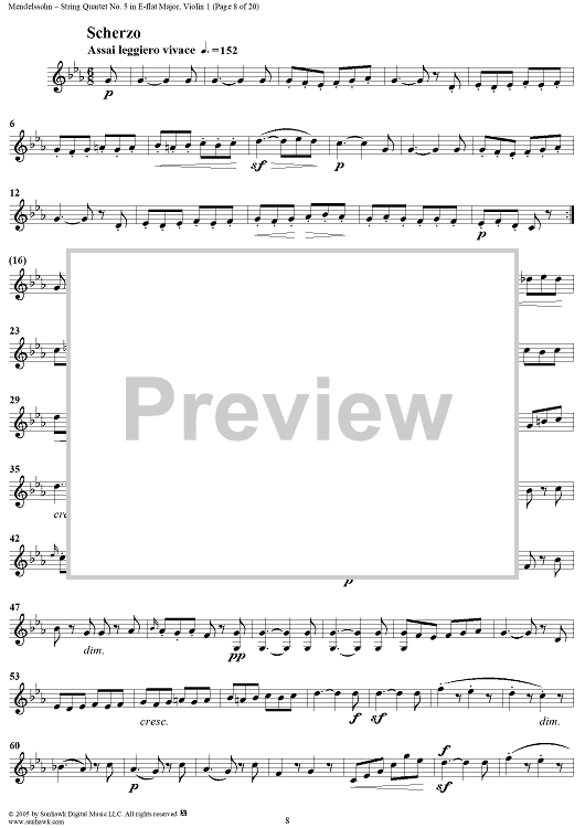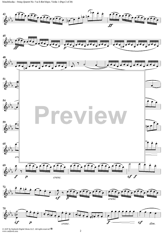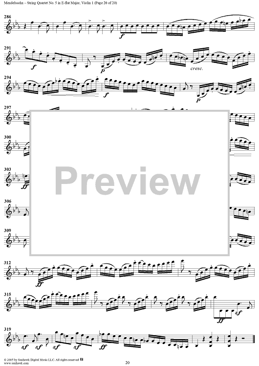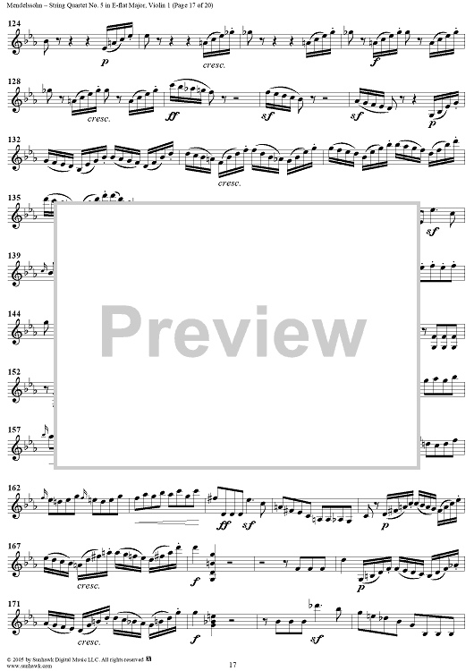 "String Quartet No. 5 in E-flat Major, Op. 44, No. 3 - Violin 1" Sheet Music by Felix Mendelssohn