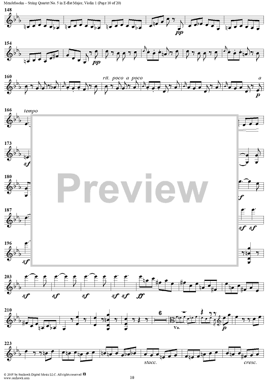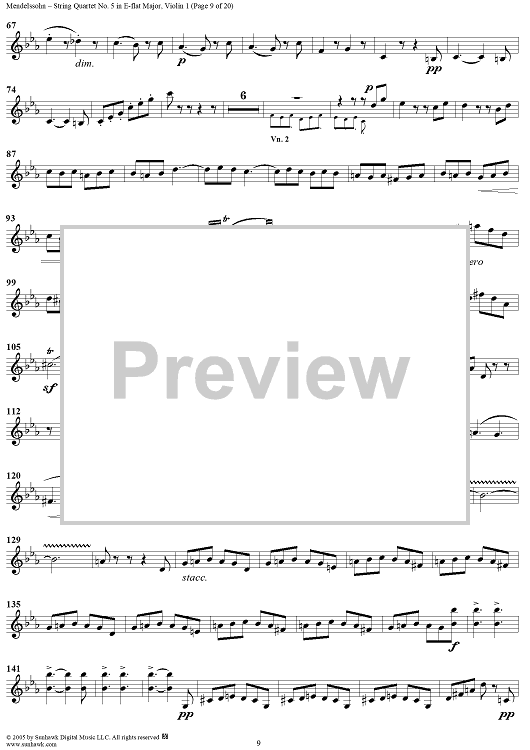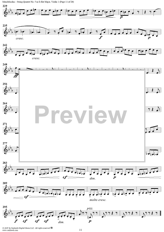 Digital Sheet Music for String Quartet No. 5 in E-flat Major, Op. 44, No. 3 - Violin 1 by Felix Mendelssohn scored for String Quartet; id:309534