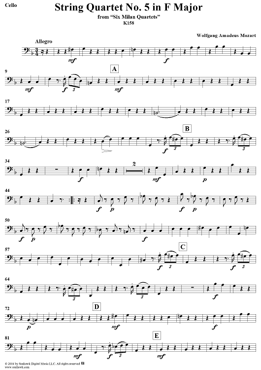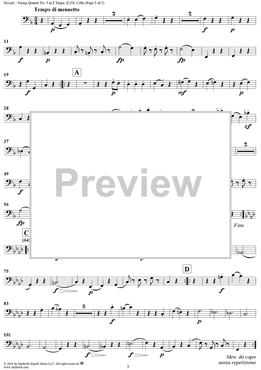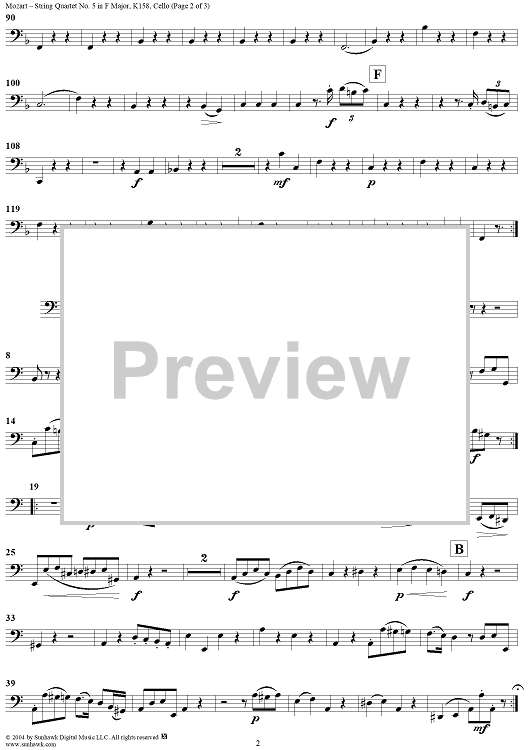 Digital Sheet Music for String Quartet No 5. in F Major, K158 - Cello by Wolfgang Amadeus Mozart scored for String Quartet; id:304095