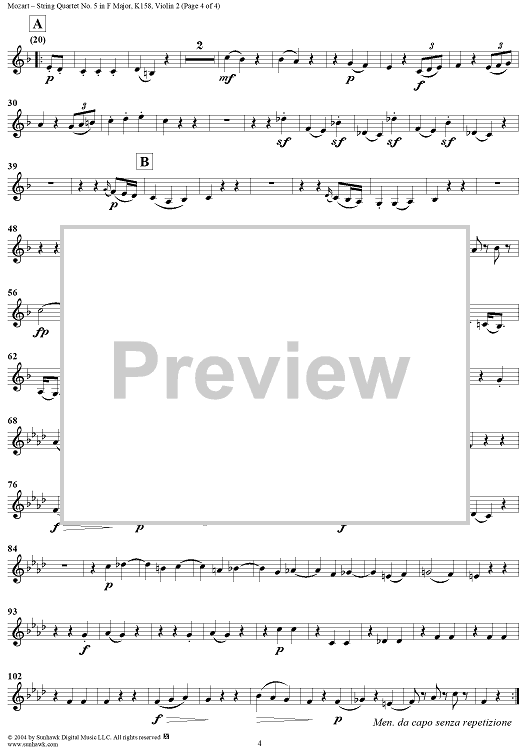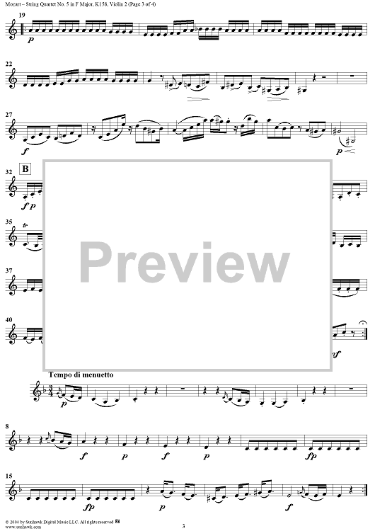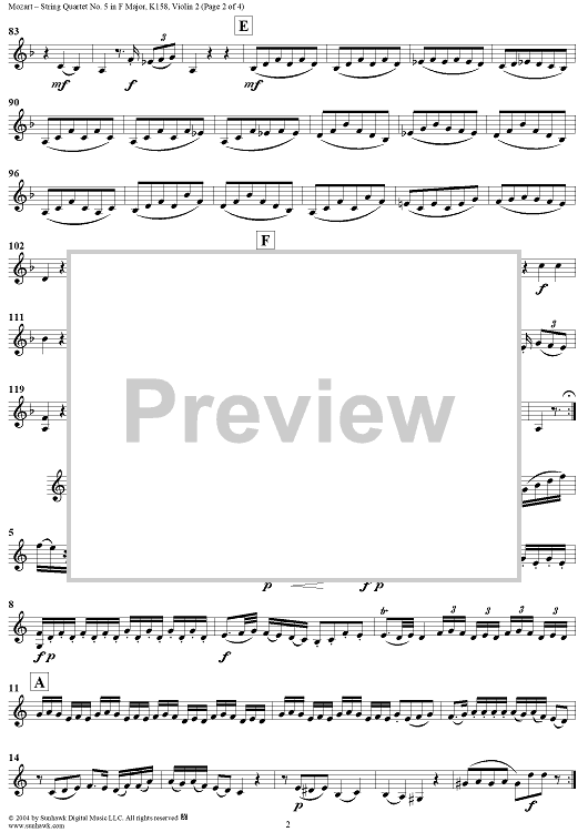 Digital Sheet Music for String Quartet No 5. in F Major, K158 - Violin 2 by Wolfgang Amadeus Mozart scored for String Quartet; id:304097
