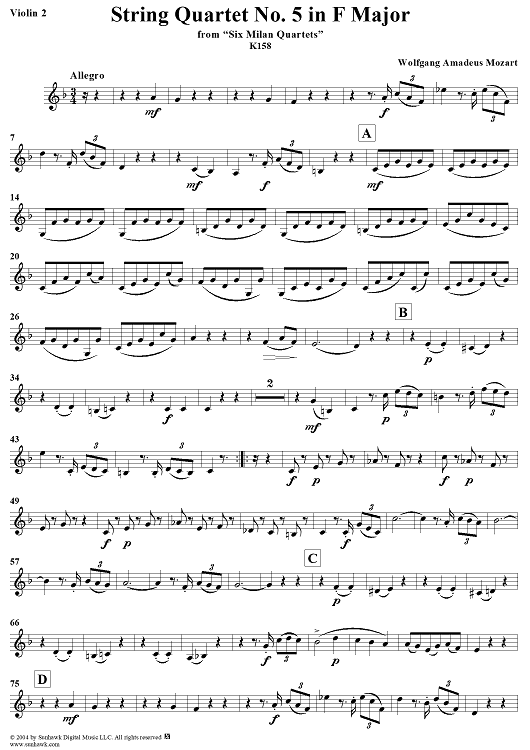 "String Quartet No 5. in F Major, K158 - Violin 2" Sheet Music by Wolfgang Amadeus Mozart