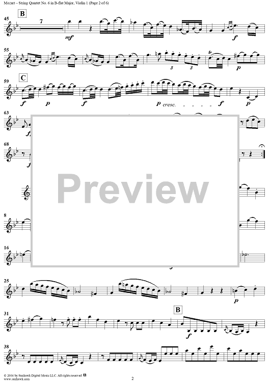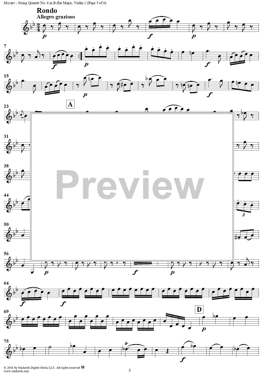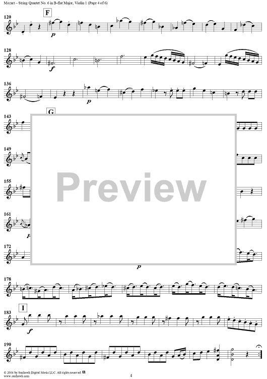 Digital Sheet Music for String Quartet No. 6 in B-flat Major, K159 - Violin 1 by Wolfgang Amadeus Mozart scored for String Quartet; id:304105