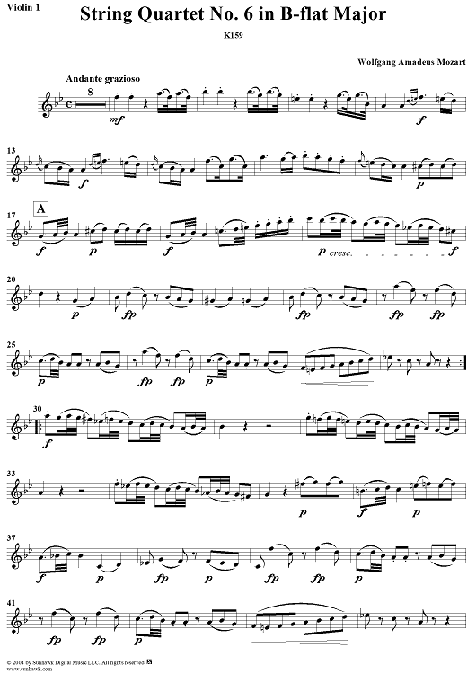 "String Quartet No. 6 in B-flat Major, K159 - Violin 1" Sheet Music by Wolfgang Amadeus Mozart