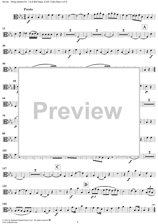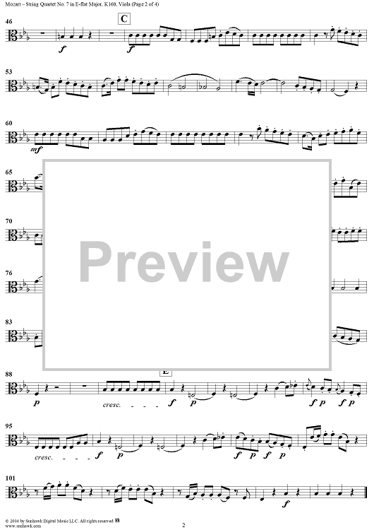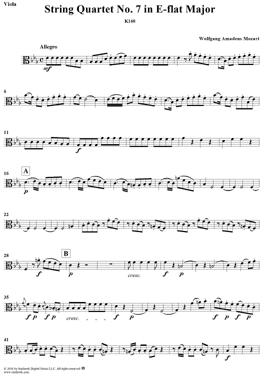 Digital Sheet Music for String Quartet No. 7 in E-flat Major, K160 - Viola by Wolfgang Amadeus Mozart scored for String Quartet; id:304110