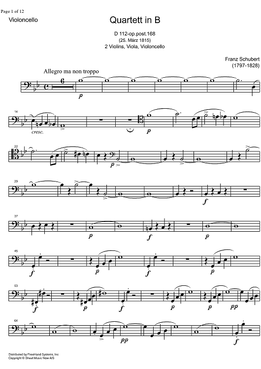 "String Quartet No. 8 B Major D112 - Cello" Sheet Music by Franz Schubert