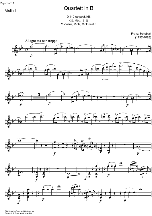 "String Quartet No. 8 B Major D112 - Violin 1" Sheet Music by Franz Schubert
