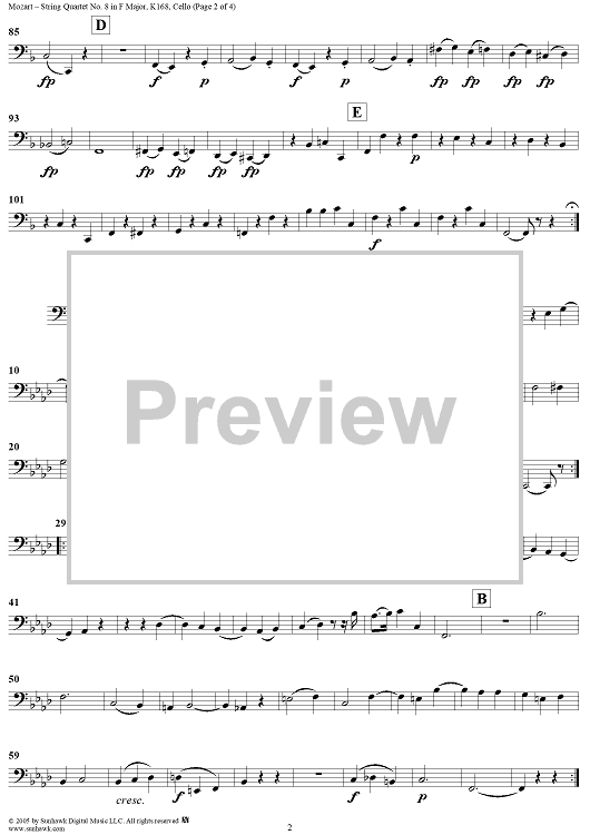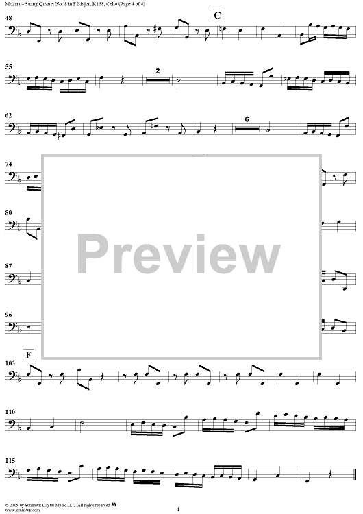 Digital Sheet Music for String Quartet No. 8 in F Major, K168 - Cello by Wolfgang Amadeus Mozart scored for String Quartet; id:304116