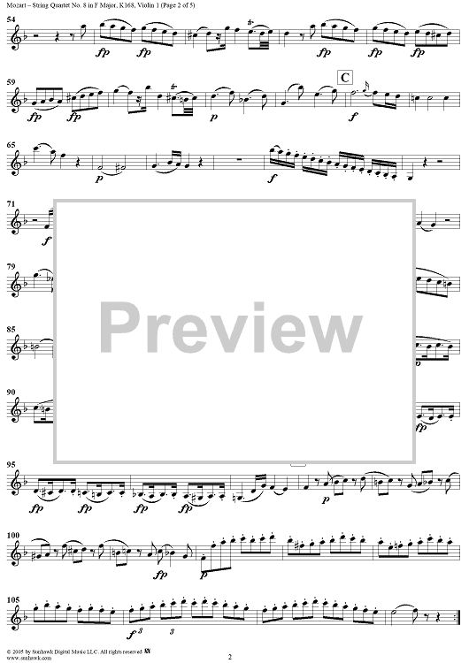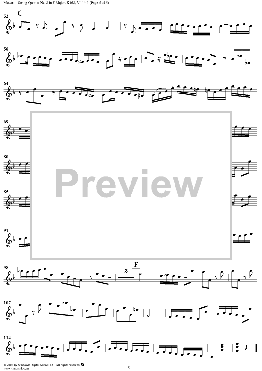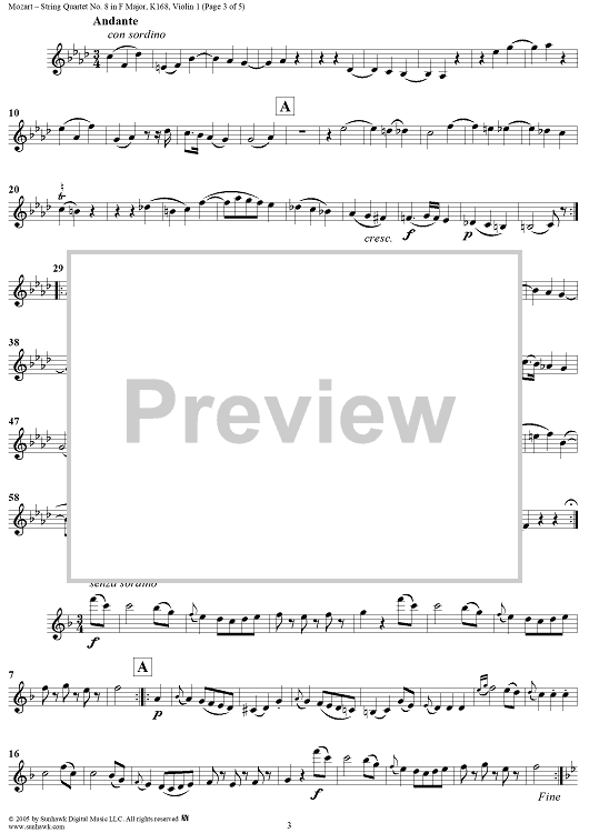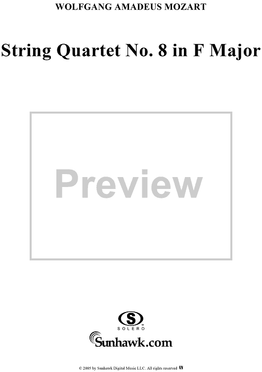 Digital Sheet Music for String Quartet No. 8 in F Major, K168 - Violin 1 by Wolfgang Amadeus Mozart scored for String Quartet; id:304113
