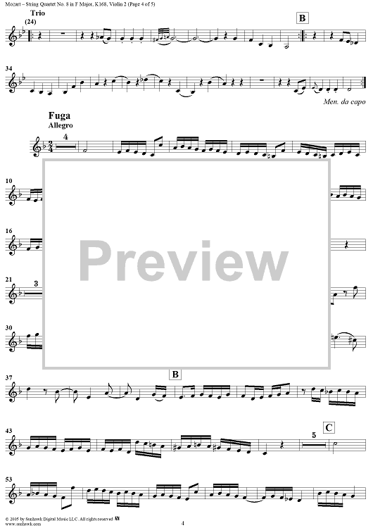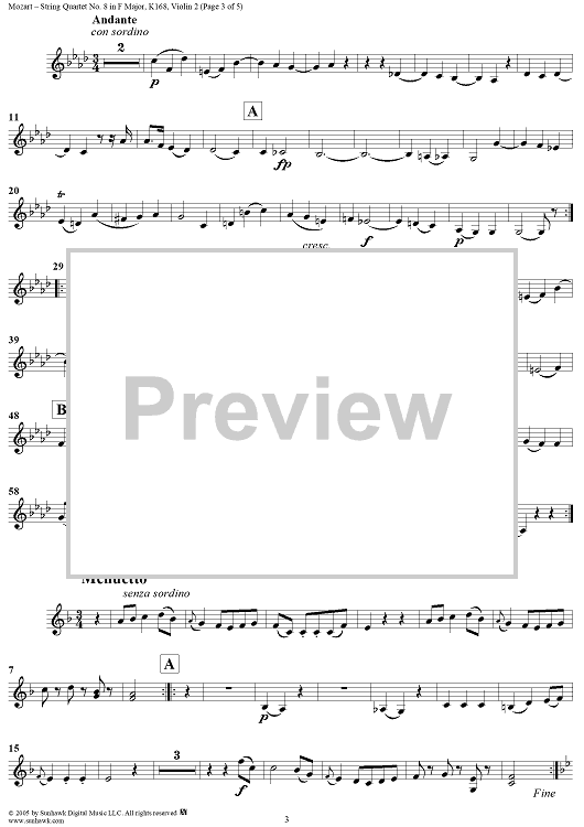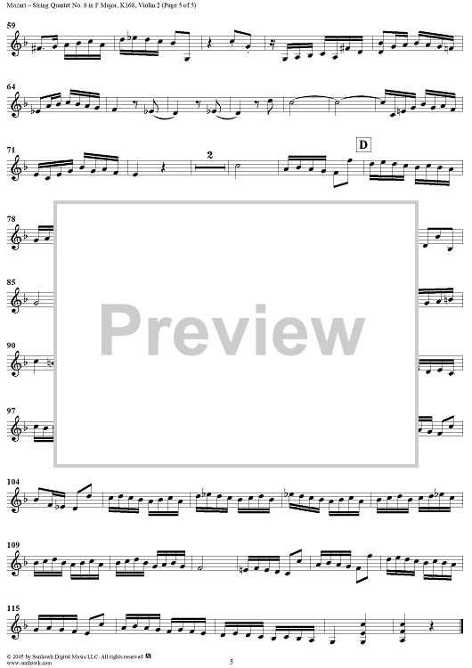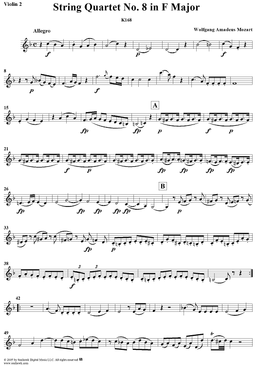 Digital Sheet Music for String Quartet No. 8 in F Major, K168 - Violin 2 by Wolfgang Amadeus Mozart scored for String Quartet; id:304114
