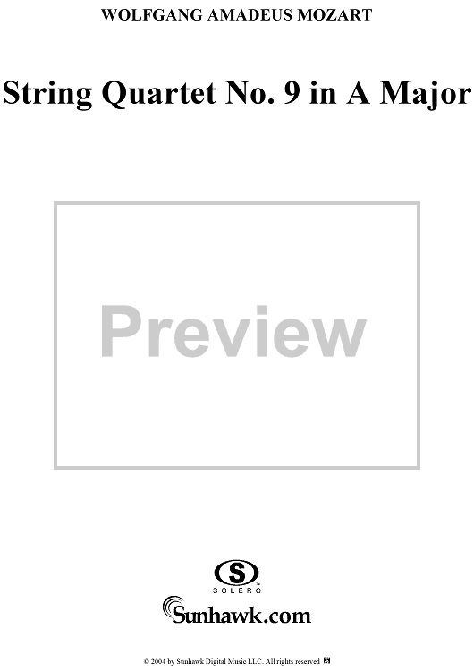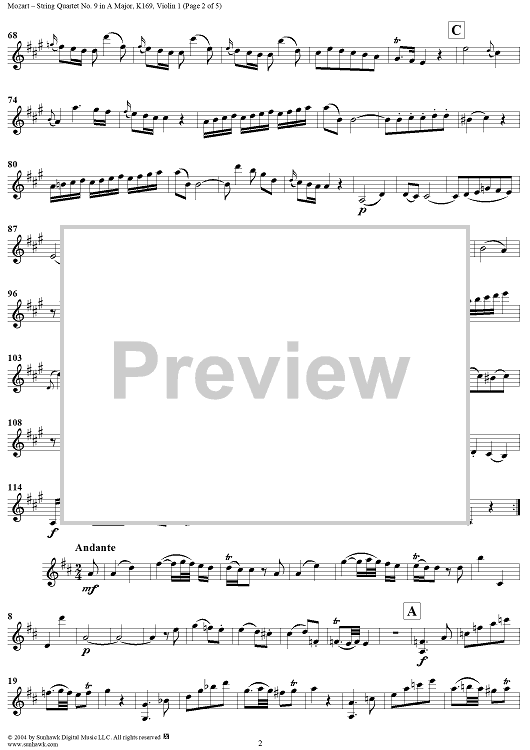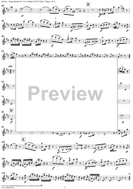 Digital Sheet Music for String Quartet No. 9 in A Major, K169 - Violin 1 by Wolfgang Amadeus Mozart scored for String Quartet; id:304123