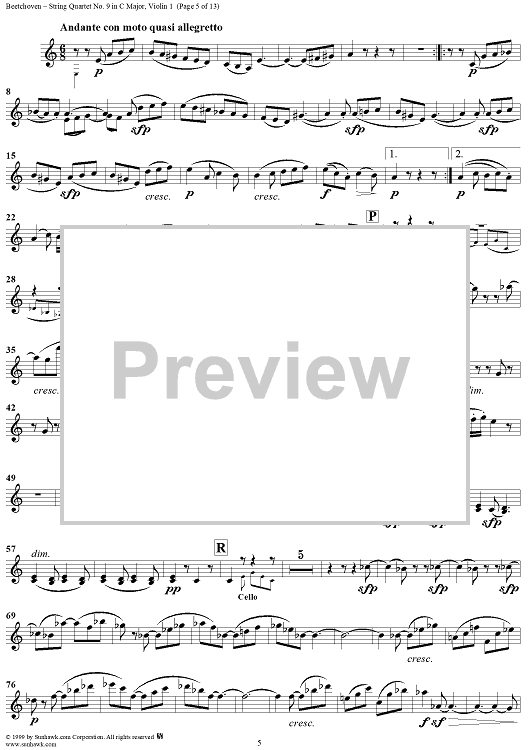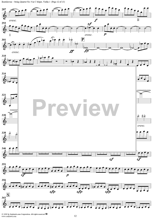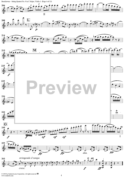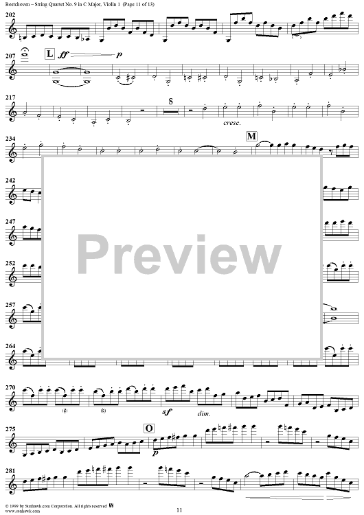 Digital Sheet Music for String Quartet No. 9 in C Major, Op. 59, No. 3 - Violin 1 by Ludwig van Beethoven scored for String Quartet; id:275309