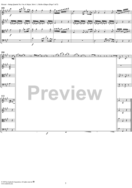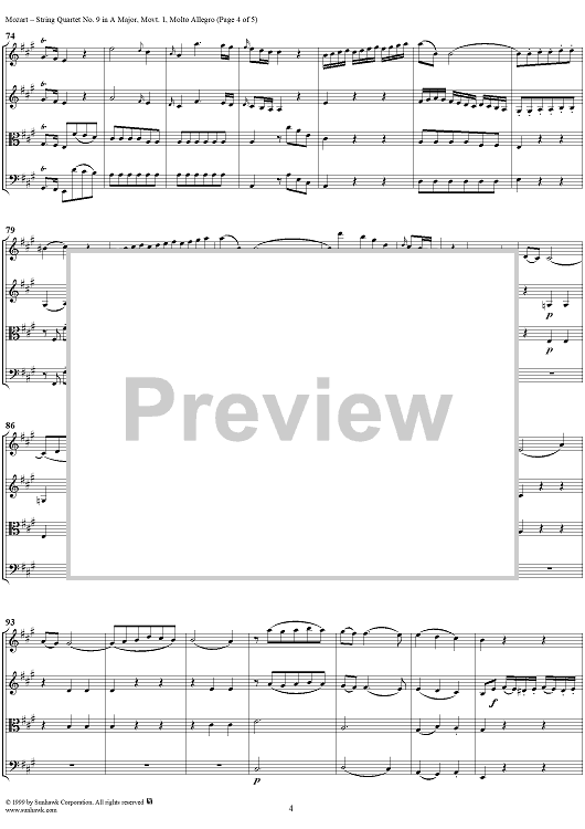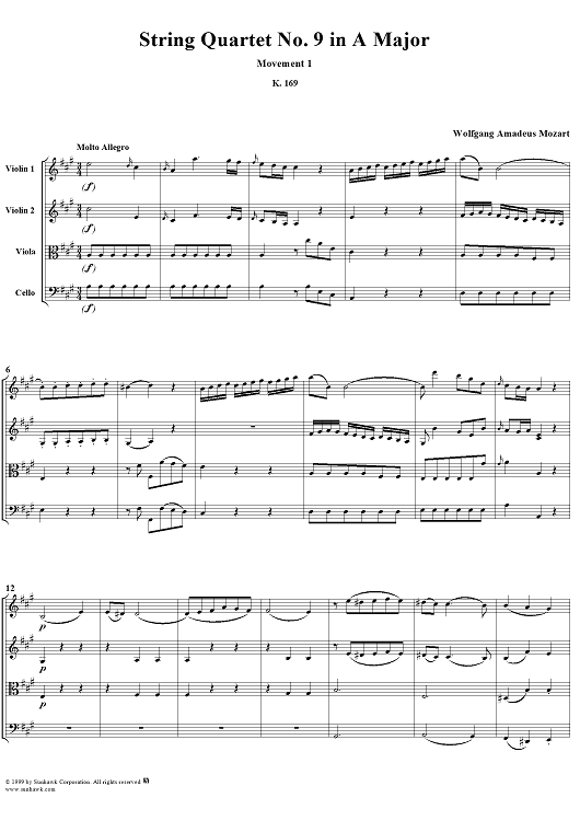 Digital Sheet Music for String Quartet No. 9, Movement 1 - Score by Wolfgang Amadeus Mozart scored for String Quartet; id:118553