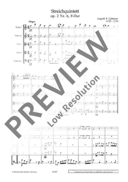 Florian Leopold Gaßmann's (1729-1774) Op. 2, 'Sei quintetti, Dilatamenti, Notturni o sia Serenate Per Violino o Flauto, Violino Secondo, Due Viole e Baßso ...' belongs among the earliest quintets, alongside those by Aumann, Vanhall, Wagenseil and a few others. In contrast to three other quintets of this series, the principal part in this quintet is free of typical instructions for the strings and double stops; it may therefore even be played by the flute. As in Joseph Haydn's first quartets Op. 1, two minuets in the current quintet frame a slow middle section, a minor movement, which interrupts the common equality of keys. Typical of the early quintet settings of the Viennese area is the arrangement of violins and violas in pairs so that the parts are often similar to a trio setting accompanied in thirds. This arrangement of parts is sometimes broken up, in this case by the solo of the principal viola in the second trio or by the brief ensemble playing of the principal violin and cello in the slow movement.
