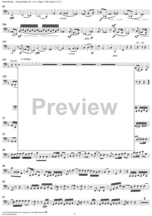 "String Quintet No. 1 in A Major, Op. 18 - Cello" Sheet Music by Felix Mendelssohn